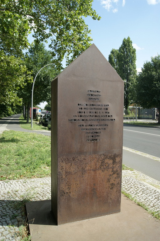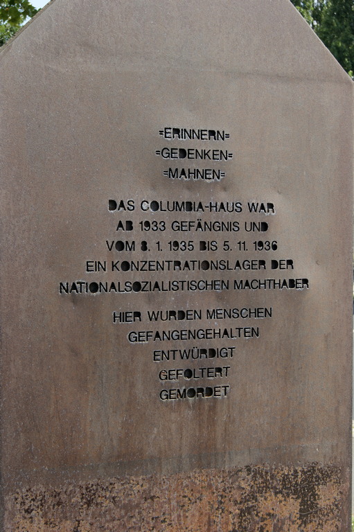 »ERINNERN / GEDENKEN / MAHNEN / DAS COLUMBIA-HAUS WAR / AB 1933 GEFÄNGNIS UND / VOM 8.1.1935 BIS 5.11.1936 / EIN KONZENTRATIONSLAGER DER / NATIONALISTISCHEN MACHTHABER / HIER WURDEN MENSCHEN / GEFANGEN GEHALTEN / ENTWÜRDIGT / GEFOLTERT / GEMORDET«