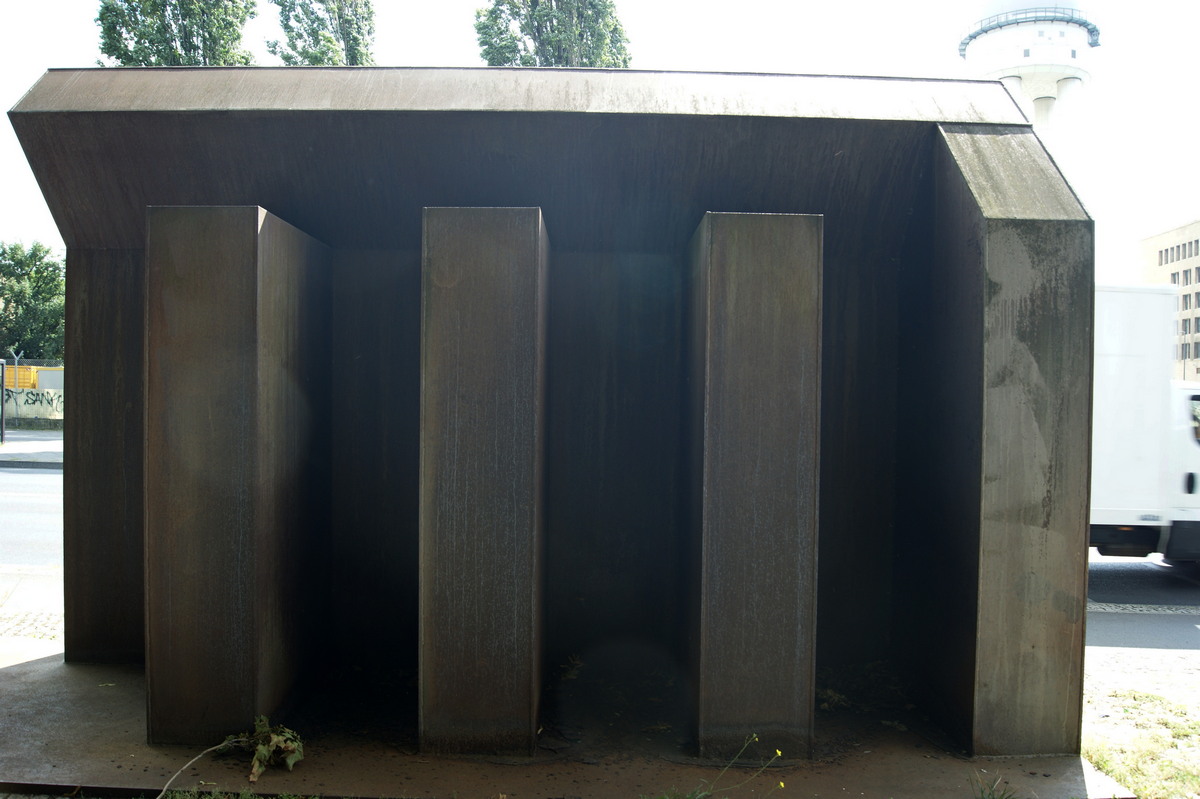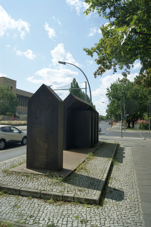 Die stilisierte hausförmige Stahlkonstruktion soll ein Zellengebäude symbolisieren. Eine auf der rechteckigen Standplatte des Monuments freistehende grabstelenartige Giebelwand erinnert mit einer vertieft und durchbrochen angelegten vielzeiligen Inschrift an das einzige direkt in Berlin errichtete SS-offizielle KZ und die hier gemarterten und ermordeten Menschen.