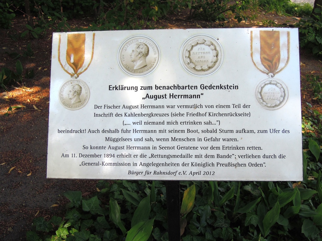 Am östlichen Ende des Dorfangers von Rahnsdorf, in der Nähe der alten Schule, ist ein Gedenkort für die Fischer von Rahnsdorf eingerichtet, die unter Einsatz ihres Lebens Menschen vor dem Ertrinken im Müggelsee bewahrten. Die kleine Platzanlage besteht aus drei Gedenksteinen, die zu einem Viertelkreis gruppiert in eine Grünanlage eingebettet liegen. Die Gedenkstele für August Herrmann nimmt die Mitte der Anlage ein. Die 1930 gesetzte Gedenkstele für den Fischermeister August Herrmann (1842–1915) besteht aus einem 194cm hohen Steinquader in Muschelkalk, einem Steinsockel im gleichen Material und einem bronzenem Porträtrelief auf dem Steinquader, das der Bildhauer Paul Gruson wohl 1929 fertigte. Der Steinquader ist mit einer Schattenfuge vom Sockel abgesetzt. Rechts von der Stele erklärt eine Erläuterungstafel den Aufstellungsgrund: Der Fischer August Herrmann war vermutlich von einem Teil der Inschrift des Kahlenbergkreuzes (siehe Friedhof Kirchenrückseite) (…weil niemand mich ertrinken sah…“) beeindruckt! Auch deshalb fuhr Herr-mann mit seinem Boot, sobald Sturm aufkam, zum Ufer des Müggelsees und sah, wenn Menschen in Gefahr waren. So konnte August Herrmann in Seenot Geratene vor dem Ertrinken retten. Am 11. Dezember 1894 erhielt er die „Rettungsmedaille mit dem Bande“; verliehen durch die „General-Kommission in Angelegenheiten der Königlich Preußischen Orden“. Bürger für Rahnsdorf e.V. April 2012 (Jürgen Tomisch / Barbara Anna Lutz).