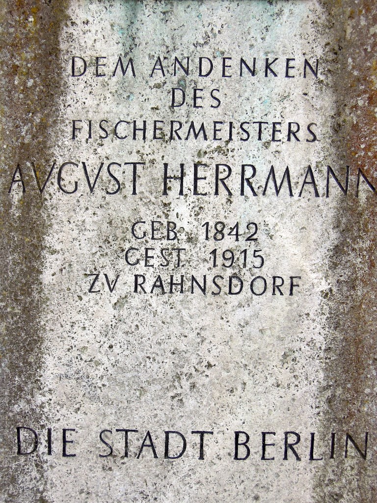»DEM ANDENKEN / DES / FISCHERMEISTERS / AUGUST HERRMANN / GEB. 1842 / GEST. 1915 / ZU RAHNSDORF / DIE STADT BERLIN«