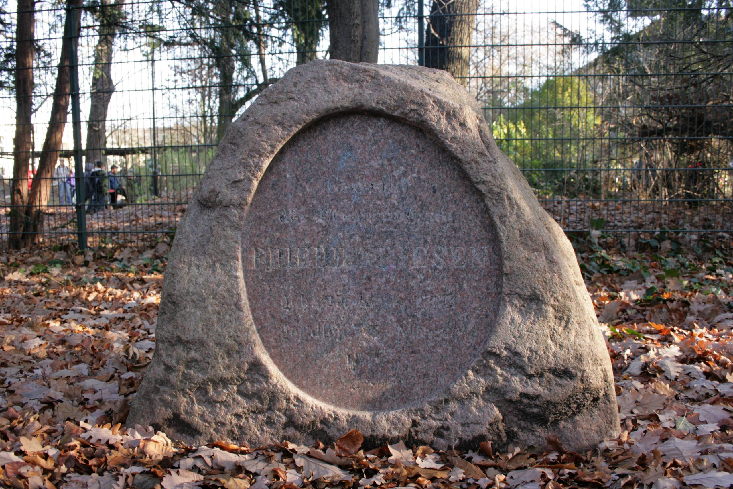 1878 wurde auf der so genannten Friesenhöhe, die an den Mitstreiter Ludwig Jahns bei der Etablierung des Turnens (Fechtens) in Preußen, Karl Friedrich Friesen (Magdeburg 1784-1814 gefallen bei La Lobbe, heute Ortsteil von Rethel, Ardennen, Frankreich) erinnerte, ein Gedenkstein aufgestellt. Das Geburtsjahr wurde dabei offenbar von Beginn an falsch angegeben, nämlich „1785“ statt „1784“. K. F. Friesen, der 1808 zusammen mit Ludwig Jahn als Lehrer an der von Johann Ernst Plamann eingerichteten Erziehungsanstalt im Sinne einer Pädagogik nach Pestalozzi wirkte, richtete 1808 eine „Fechtbodengesellschaft“ ein, in der neben dem Fechten auch politische Themen behandelt wurden. Friesen wirkte 1811 auf dem von Ludwig Jahn begründeten Turnplatz in der Hasenheide als Vorturner, leitete in den Wintermonaten den „Turnkünstlerverein“ und entwickelte viele neue Turnübungen. Eine Schwimmanstalt an der Oberbaumbrücke geht ebenfalls auf K. F. Friesen zurück. Im Zusammenhang mit der Umgestaltung der Hasenheide 1934-1936 im Vorfeld der Olympiade in Berlin wurde auch die Friesenhöhe in Ordnung gebracht. Eine Überprüfung des Zustandes erfolgte 1937 (entsprechendes Schreiben von 1937 in dem Ordner zur Dokumentation „Hasenheide“ im Grünflächenamt des Bezirks Neukölln von Berlin). Bei der Enttrümmerung von Berlin wurde die Friesenhöhe mit Trümmerschutt überfangen und ging als solche verloren. Der Gedenkstein wurde unweit des Parkeinganges Fontanestraße / Karlsgartenstraße neu aufgestellt. Zu einem bisher unbekannten Zeitpunkt - wohl in den 1990er Jahren - wurde der Stein umgestürzt, so dass die Inschriftenseite nicht mehr zu erkennen war. Rainer Sodeikat vom Grünflächenamt, zuständig für die Planungen zur Hasenheide, fand den Gedenkstein bei Erneuerungsarbeiten in diesem Parkbereich. Im Zusammenhang mit verschiedenen Maßnahmen zur Eindämmung des Drogenhandels in der Hasenheide ließ Sodeikat einen gepflasterten Platz anlegen und dort feste Schachtische und feste Sitzgelegenheiten für einen lokalen Schachverein einrichten. 2008 erhielt der Gedenkstein an der hinteren Begrenzung des Platzes innerhalb der dortigen Bepflanzung einen neuen Aufstellungsort (Jörg Kuhn).