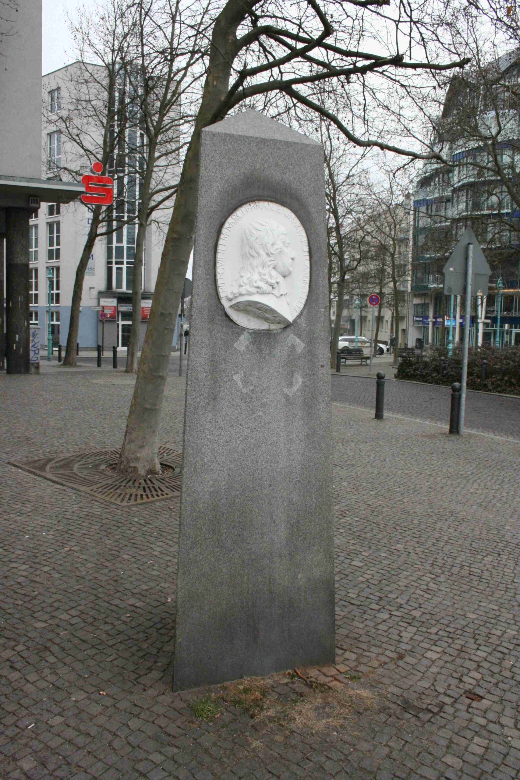 Obeliskenartiger Pfeiler über dreieckigem Grundriss. Im oberen Teil eingelassen zwei hochovale Bildnisreliefs mit Profilporträts des kurfürstlichen Paares und umlaufenden Inschriften (Jörg Kuhn).