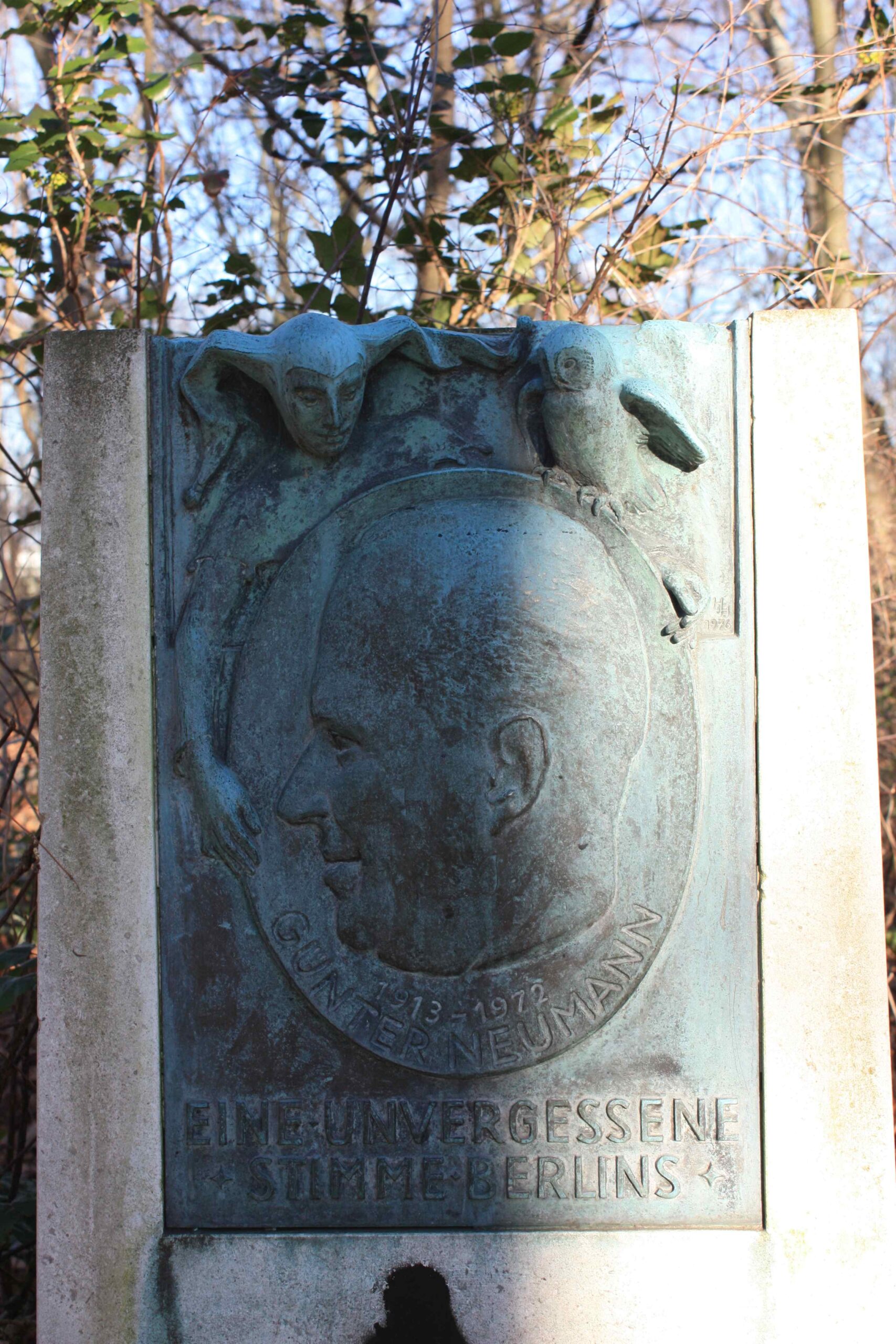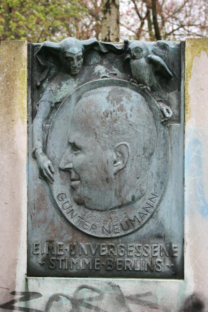 Stele aus feinem hellgrauen Sichtbeton mit eingelassenem Bronzerelief im oberen Bereich. Das Relief zeigt das Porträt von Günter Neumann, begleitet von der im oberen Bereich angeordneten Figur des Til Eulenspiegel mit der Weisheit anzeigenden Eule. Das in etwa ovale Schild mit dem nach links gewandten Profilporträt Neumanns ist als Spiegel und damit als zusätzliches Attribut Eulenspiegels und des Kabarettisten an sich zu sehen. Das Relief trägt unter dem Porträt die vertiefte Inschrift: 1913-1972 / GÜNTER NEUMANN und im unteren Bereich in erhabenen Lettern die Inschrift: EINE UNVERGESSENE / STIMME BERLINS. (Jörg Kuhn).