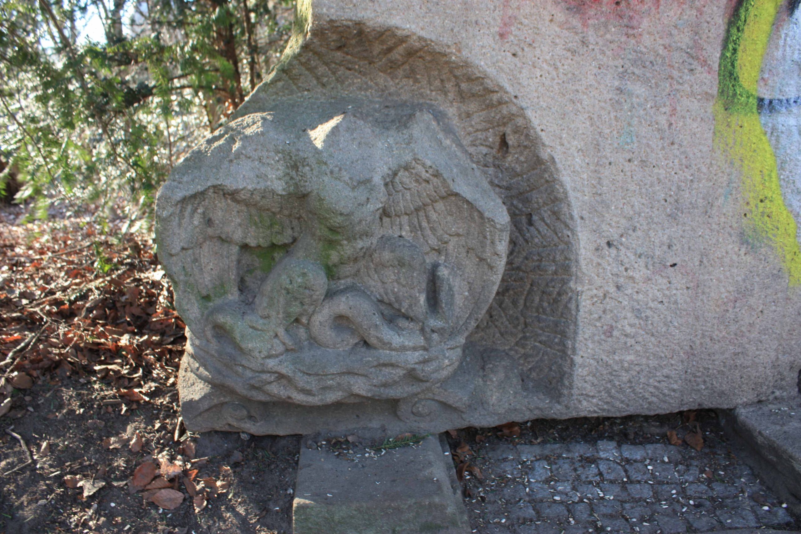 Langgestrecktes, blockhaftes Monument aus zwei größeren Kunststeinblöcken, aufgestellt über drei Fußsockeln. Der linke Block zeigt im unteren linken Bereich Reste eines figürlichen Reliefs, einen Adler darstellend, der eine Schlange in den Fängen hält und so das sichtbare Nest schützt. Die Adlerfigur ist beschädigt. Die zur Wegkreuzung ausgerichtete Front des Monuments trägt die Inschrift (Jörg Kuhn).
