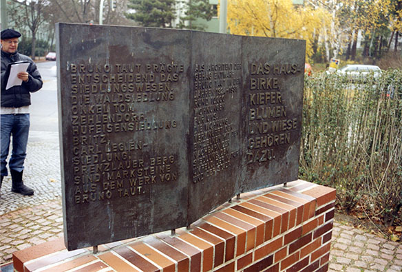 »(linke Fläche:) BRUNO TAUT PRÄGTE / ENTSCHEIDEND DAS / SIEDLUNGSWESEN, / DIE WALDSIEDLUNG / ONKEL TOM / ZEHLENDORF, / HUFEISENSIEDLUNG / BRITZ, CARL LEGIEN- / SIEDLUNG, / PRENZLAUER BERG / SIND MARKSTEINE / AUS DEM WERK VON / BRUNO TAUT. (mittlere Fläche:) ALS ARCHITEKT DER / GEHAG ENTWARF / BRUNO TAUT IN DEN JAHREN 1924-1931 / RUND 10.000 / WOHNUNGEN / FÜR UNS. / DIE WOHNUNG / VERKNÜPFT DEN / EINZELNEN MIT DEN / NACHBARN DER / SIEDLUNG, DEM / UMFELD, DER NATUR / UND SEINER STADT. (rechte Fläche:) DAS HAUS-/ BIRKE, / KIEFER, / BLUMEN / UND WIESE / GEHÖREN /DAZU.«