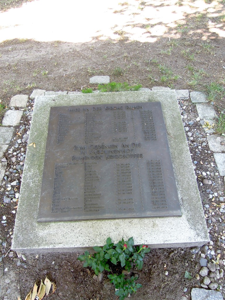 Das 1920 eingeweihte Denkmal erinnert an die im Ersten Weltkrieg 1914–1918 gefallenen Einwohner der Orte Schmöckwitz und Karolinenhof. Es wurde vom Südtiroler Bildhauer Georg Hengstenberg geschaffen und vom Karolinenhofer Formenbauer Bildhauer Saake gefertigt. Auf einer kreissegmentförmigen Anlage, umgeben von einer Halbrundbank, steht ein Sarkophagähnliches Objekt mit Figurengruppe auf hohem Sockel; es ragt diagonal in das Segment hinein. Auf dem Sockel liegt ein ruhender Löwe, auf diesem reitet ein nackter Knabe, der sich auf eine umgekehrte, verlöschende Fackel in melancholischer Haltung abstützt. Die andere Hand ruht, einen Siegerkranz haltend, auf der Löwenmähne. „Das Antlitz des Knaben zeigt das Porträt des damals 12 jährigen Waldemar Schumacher, der Modell gesessen hat.“ (Der Uhu: http://www.der-uhu-link.de/index.php/ausgewaehlte-artikel/kultur/23-ein-denkwuerdiges-denkmal-genius-mit-fackel-und-lorbeerkranz-in-schmoeckwitz). Das aus rotem Sandstein gefertigte Denkmal wurde mit „Genius mit Fackel und Lorbeerkranz“ bezeichnet. Der Junge ist aufgrund seiner verkehrt herum gehaltenen Fackel als Genius des Todes zu erkennen. Der Löwe gilt seit Rauchs Grabmal für Scharnhorst als Symbol der Tapferkeit der preußischen Armee und wurde nach der Kriegsniederlage ruhend dargestellt. Georg Hengstenberg folgt damit der Bildtradition, die den Genius des Todes als einen lieblichen Jüngling auffasst. Er geleitet die Verstorbenen mit sanftem Zuspruch in das Reich der Toten. An den Seiten des Sockels sind drei Inschriftentafeln – Längsseiten und Stirnseite zur Kirche – vorhanden, deren eingemeißelte Texte stark verwittert, z.T. überputzt, und kaum noch lesbar sind. Die Tafeln der Längsseiten tragen die Namen der zehn Gefallenen aus dem Ersten Weltkrieg sowie ihr Todesdatum und den Gefallenenort. Die Tafel auf der Stirnseite ist unkenntlich. Inmitten der kleinen Parkanlage, die die Kirche umgibt, ist für das Denkmal ein würdiger Platz gefunden worden. Direkt vor der Kirche platziert, steht der Kirchgänger unmittelbar dem Denkmal gegenüber. Seit 1997 befindet sich neben dem Denkmal für die Gefallenen des Ersten Weltkrieges eine Bodenplatte in Kunststein mit einer bronzenen Schrifttafel zur Erinnerung an die Gefallenen im Zweiten Weltkrieg aus Schmöckwitz und Karolinenhof mit der Inschrift: „Hier an der Kirche ruhen“, es folgen Nachname, Vorname, Geburtsdatum, Sterbejahr der 14 Gefallenen, soweit bekannt, und „Zum Gedenken an die in Karolinenhof ruhenden Kriegsopfer“. Es folgen Nachname, Vorname, Geburtsdatum, Sterbejahr der 17 Gefallenen, soweit bekannt (Jürgen Tomisch / Barbara Anna Lutz).