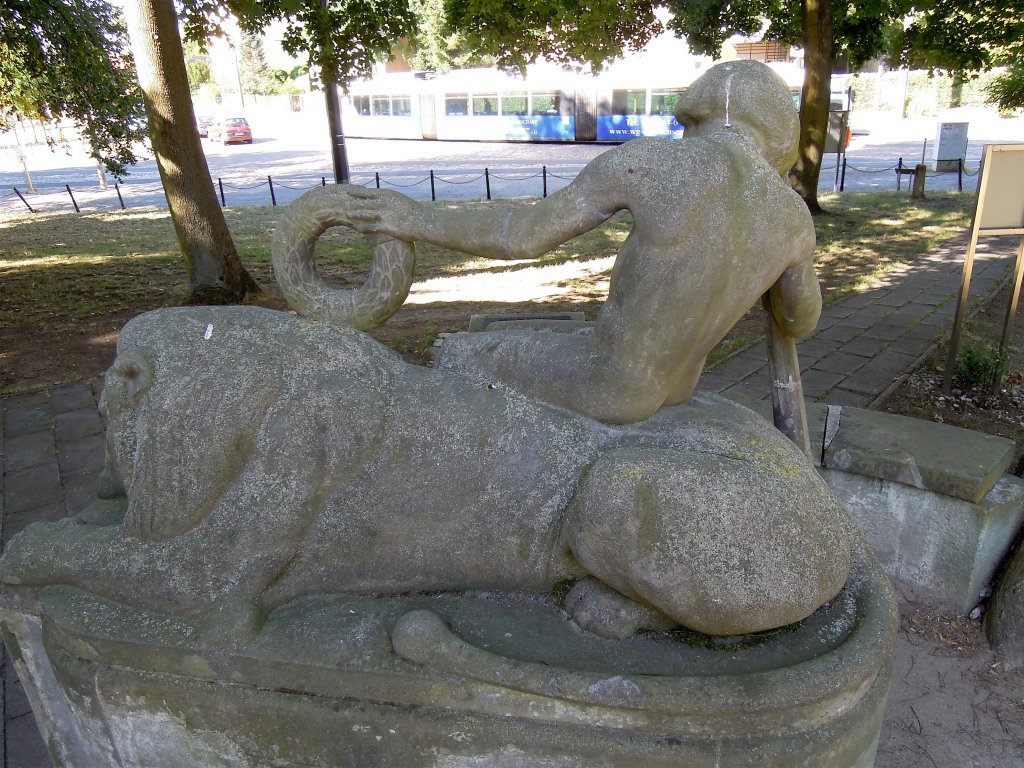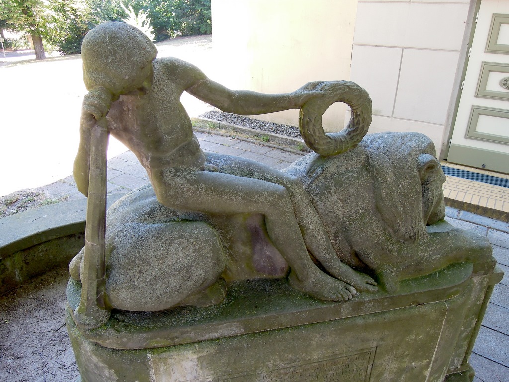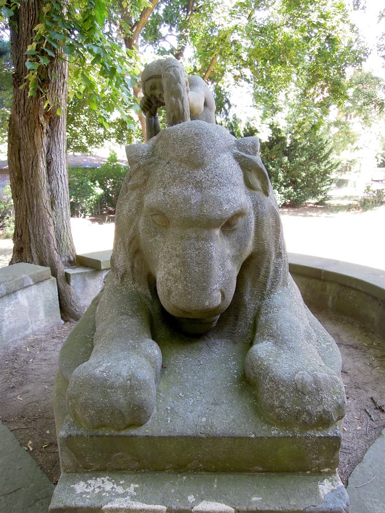 Das Gefallenendenkmal wurde vom Südtiroler Bildhauer Georg Hengstenberg und dem Karolinenhofer Formenbauer Bildhauer Saake gefertigt und am 9.10.1920 vom Amtsvorsteher Schünemann eingeweiht. Nach dem Zweiten Weltkrieg wurde in unmittelbarer Nähe eine Tafel mit den Namen der Gefallenen die-ses Krieges ergänzt. Einige der Toten sind an der Kirche begraben. 2012 fand eine umfangreiche Restaurierung statt, die allerdings lediglich die Jungenfigur betraf. Sie war stark beschädigt, Dem Jüngling fehlten Kopf und Arme mit Fackel und Lorbeerkranz. Der Kopf ging nach 2003 verloren, Arme und Attribute schon früher. Die fehlenden Teile wurden ergänzt. Auch die fehlende linke vordere Löwentatze wurde wohl damals wieder angefügt. Die Schrifttafeln am Sockel sind größtenteils unkenntlich. Das Schriftbild ist z.T. ausgefroren oder überputzt worden. Die Halbrundbank ist nach dem zweiten Segment in der Fuge von einem wachsenden Baum auseinandergedrückt worden, vor längerer Zeit hat man dort ein Zwischenstück eingefügt, was jetzt nicht mehr vorhanden ist, die Abdeckung der Sitzbank ist an mehreren Stellen abgeplatzt (Jürgen Tomisch / Barbara Anna Lutz).