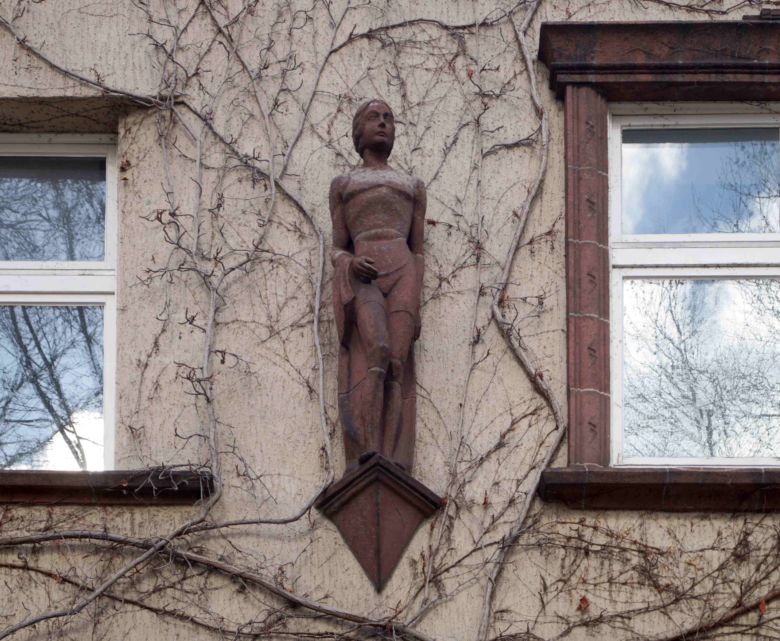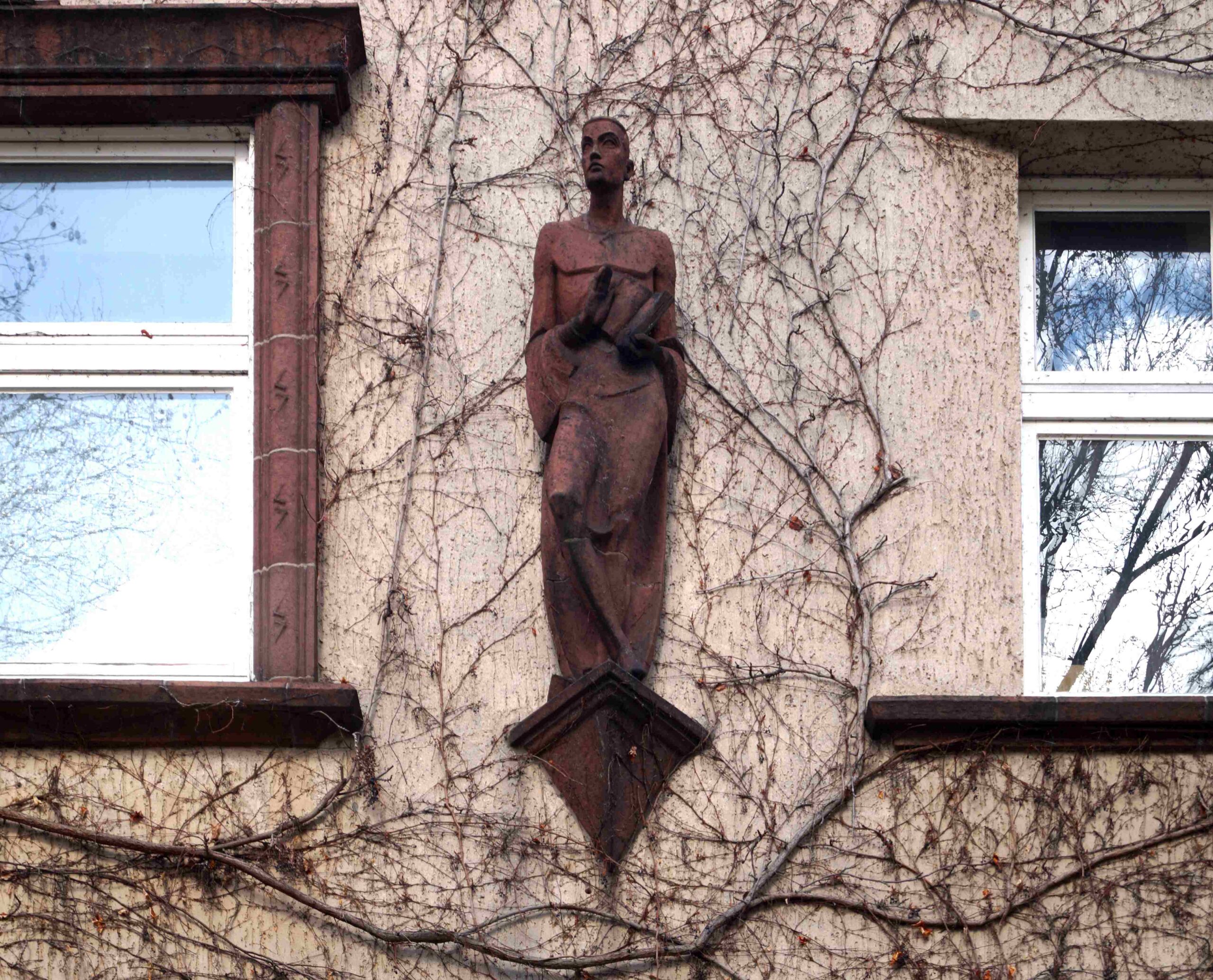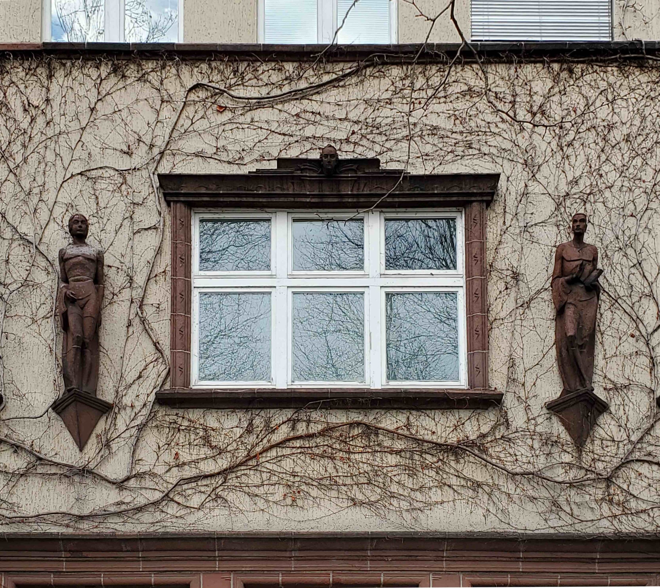 Die Modell für die beiden Figuren, das Portal sowie die Portalbekrönung hat der Bildhauer Gerhard Schliepstein entworfen. Die Ausführung in Keramik war den Siegersdorfer Werken übertragen worden (Nicola Vösgen).