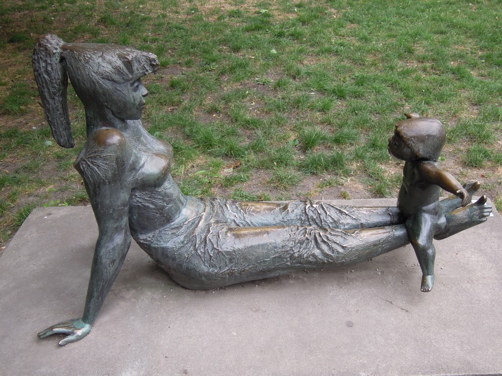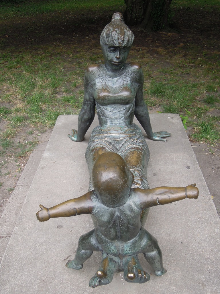 Auf einem rechteckigen Betonsockel ist plinthenlos die aus zwei Figuren bestehende Genregruppe einer mit einem Kind spielenden jungen Frau montiert. Die offenbar die (viel) ältere Schwester darstellende Figur einer mit engem Kleid bekleideten jungen Frau mit Ponyfrisur und Pferdeschwanz sitzt, sich mit beiden beiden gestreckten Armen schräg nach hinten abstützend mit auf dem Sockel laufliegenden Handballen bei teils frei bewegten Fingern. Ihre parallel geführten Beine hat sie schwebend zum Bauchmuskeltraining nach vorne gestreckt, die unbekleideten Füße zeigen die einzeln definierten Zehen abgespreizt. Auf den Fußgelenken sitzt ein Kleinkind im Strampelanzug und enganliegender Kappe. Die babyspeckigen Beine sind wie beim Reiten herabhängend, die Arme seitlich ausgestreckt. Die Geschwister schauen sich an (Jörg Kuhn, Susanne Kähler).