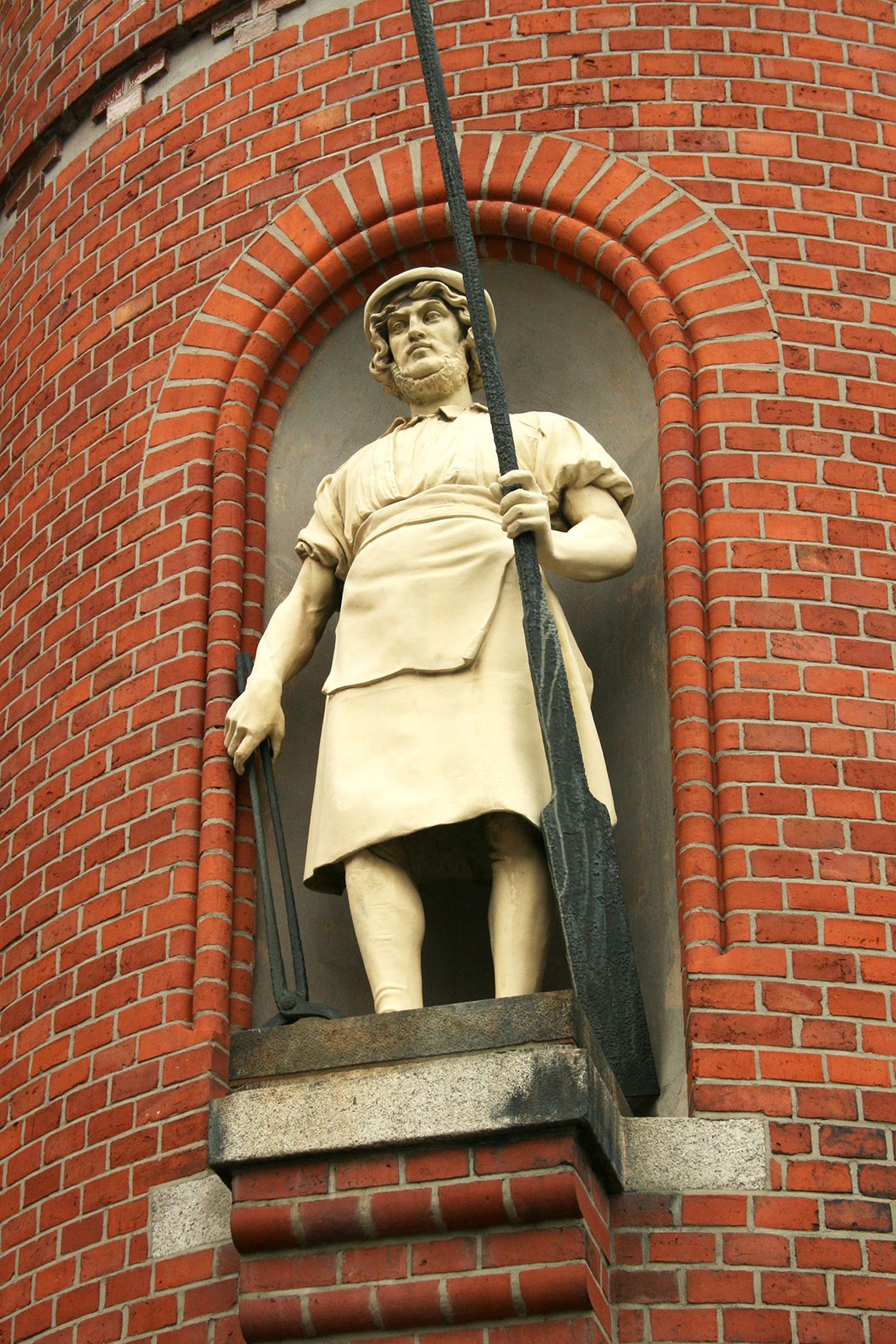 Der „Gießer“ und der „Schmied“ sind deutlich ein Paar und offensichtlich nach derselben Vorlage entwickelt worden. Sie unterscheiden sich in Haartracht und Kleidung, insbesondere aber durch ihre Attribute. Die aus Eisen gefertigten Werkzeuge mit ihren stark genarbten Oberflächen sind Originale aus Borsigs Fabrik. Ihr Erscheinungsbild entspricht dem „mittelalterlicher Handwerkerdarstellungen, wozu vor allem die »Dürerkappe«, die wie geschnitzt wirkenden Kopf-und Barthaare und die Beinkleider beitragen.“ (Bezirksamt Tiergarten von Berlin [Hrsg.], 1993, S. 11).
