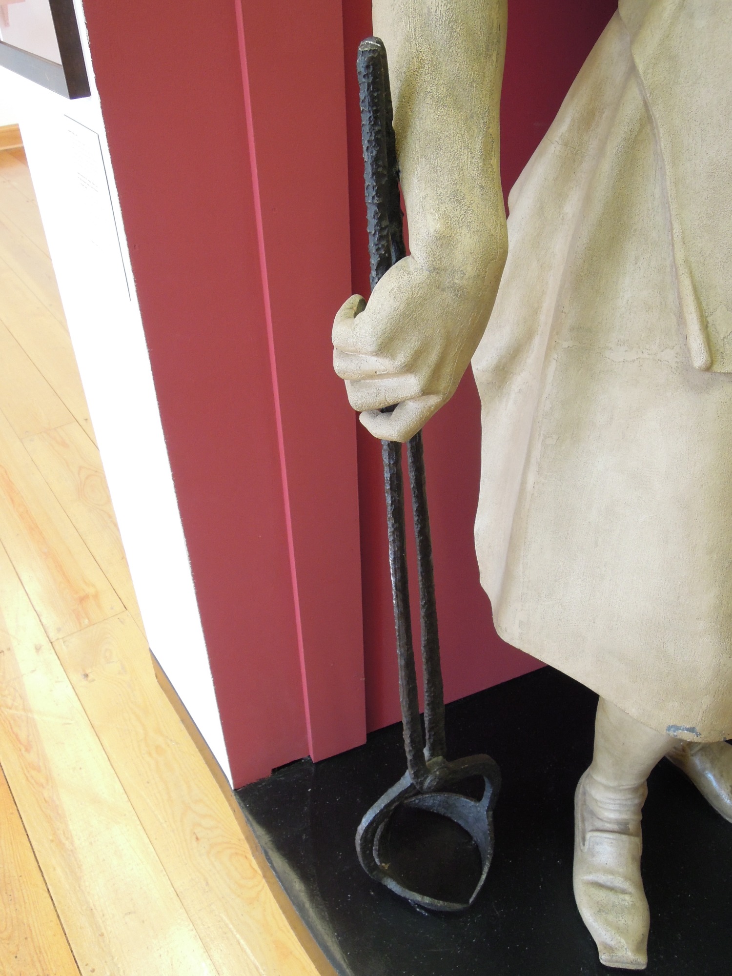 In seiner linken Hand hält der Gießer eine Abstechstange, seine rechte umschließt den Griff seiner Masselzange. Er muss beweglich sein und trägt daher im Gegensatz zum Schmied eine kurze Schürze, „sie bedeckt nur gerade das Knie und hat auch kein Oberteil. Dafür […hat er] in der Bauchgegend eine zusätzliche Vorsatzschürze in rechteckiger Form vorgebunden“ (Ebenda.) , die ihn z.B. beim Transport der heißen Formkästen, vor der Hitze schützt.