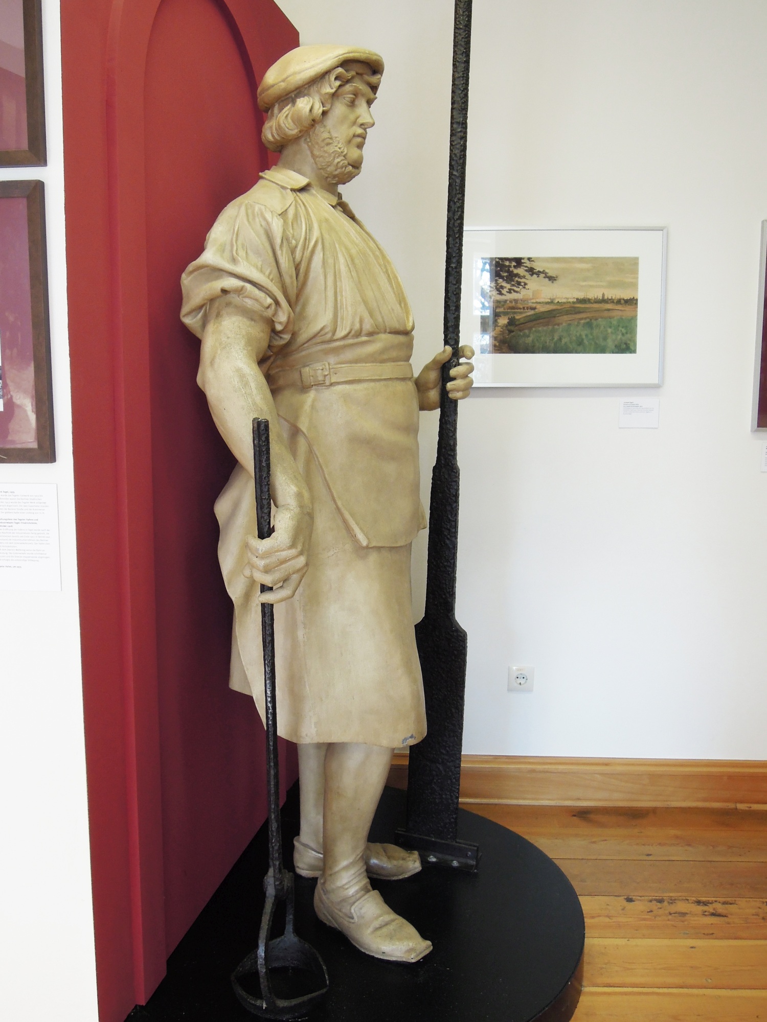 Der Gießer trägt wie der Schmied eine weite Bluse mit aufgekrempelten Ärmeln, enge Beinkleider und Halbschuhe. Seinen Bart und auch das Haupthaar trägt er kürzer, der Kragen seines Hemdes ist geschlossen.