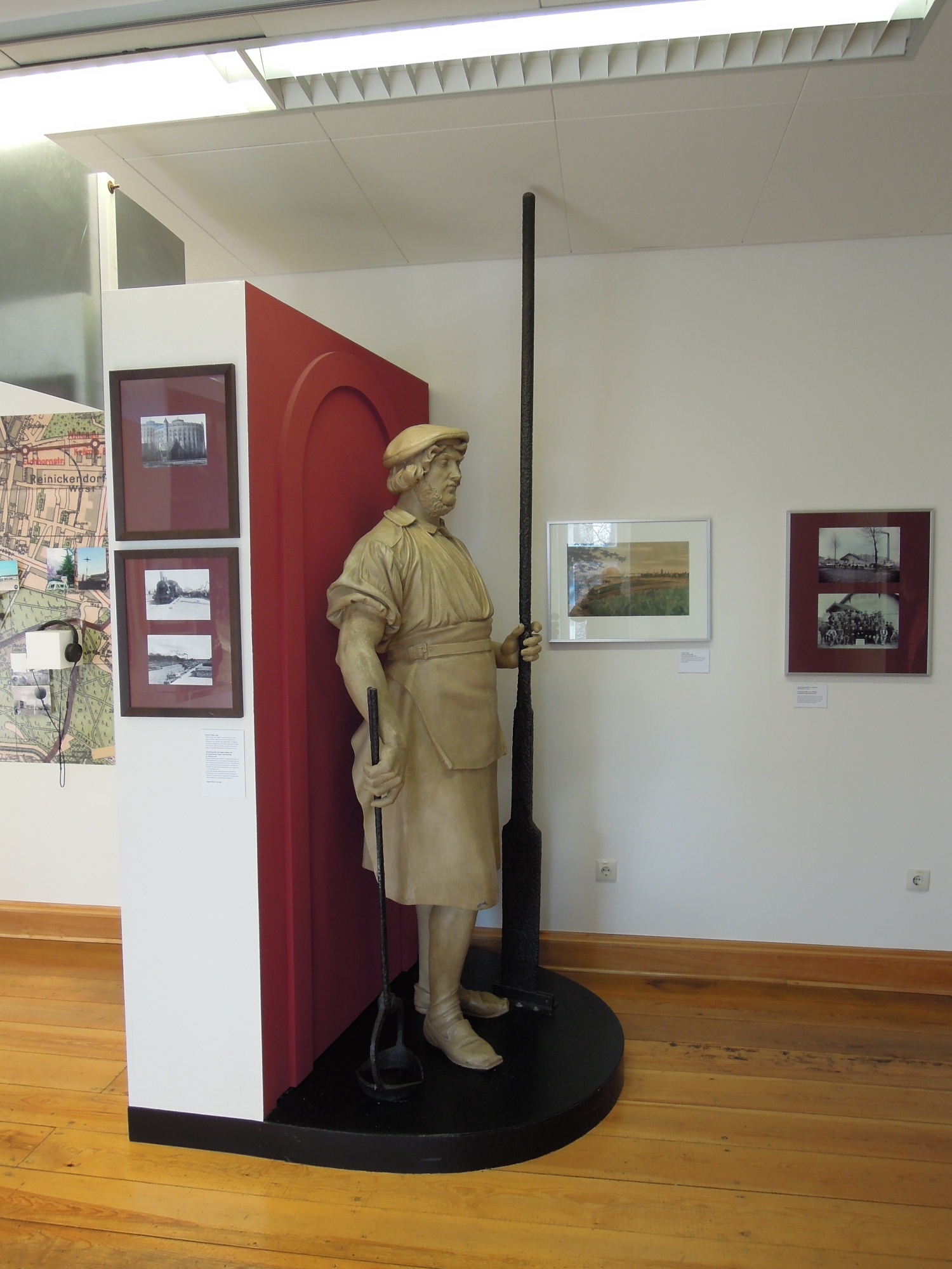 Die beiden Figuren Schmied und Gießer sind eng mit der Entwicklungsgeschichte der von August Borsig gegründeten Gießerei und Maschinenbau-Anstalt verbunden. Sie spiegeln in gewisser Weise das Wachstum und die Entwicklung der Borsigwerke wider. Auf welchen Künstler die in einem Zinkgussverfahren hergestellten Figuren zurückgehen, ist noch nicht endgültig geklärt. Der früheste Hinweis auf eine solche Arbeiterfigur ist von einer Schmied-Plastik überliefert, die der Bildhauer Gustav Blaeser für die Borsigwerke geschaffen hat. August Borsig gründete 1837 vor dem Oranienburger Tor, in der Berliner Chausseestraße seine erste Fabrikanlage. 1845 ließ Borsig das Hüttengebäude seines Werks vergrößern. „Exponiert im Zentrum des Areals und mit der Front zur Chausseestraße gewandt, wurde […] ein »Turm 3 Etagen hoch, mit Uhr, zur Aufnahme eines Wasserreservoirs« errichtet…“. Der Bildhauer Gustav Blaeser erhielt 1845/46 den Auftrag, für diesen Turm die Figur eines, vermutlich bronzenen, Schmiedes anzufertigen (vgl. Puls 1996, S.229 f., WVZ 45.1). In der Folge schuf er noch verschiedene andere Arbeiten im Auftrag der Familie Borsig (vgl. Puls 1996, S.230). Zwischen 1847 und 1850 entstand in Moabit an der Spree eine zweite große Werksanlage. Gegen Ende des 19. Jahrhunderts verlegten die Borsig-Werke ihren Sitz schließlich nach Tegel, wo 1897-1899 auf einem großen Areal am Tegeler See nach Planung der Architekten Konrad Reimer & Friedrich Körte neue Betriebsstätten errichtet worden waren. Im Zuge der Umsiedlung wurden die Standorte in Moabit und an der Chausseestraße aufgegeben. Die Werksanlagen an der Chausseestraße brach man ab; der Schmied von Blaeser gilt seither verschollen (vgl. Puls 1996, S.231). Seine Form und Gestaltung diente aber vermutlich als Entwurfsvorlage für die heute im Museum Reinickendorf ausgestellten Figuren von Schmied und Gießer. Sie sind bereits 1853 vom Kunstformer Heinrich Ehrike gegossen und von Gustav Seidel und Louis Köppen zusammengefügt worden. „Ihre erste Erwähnung findet sich im Zusammenhang mit der Dekoration des Borsig-Festes zur Vollendung der 500. Lokomotive im März 1854, wo sie „als Repräsentanten der Eisenfabrikation und des Maschinenbaues“ (in: Nationalzeitung, 26.3.1854, nach: Bezirksamt Tiergarten von Berlin (Hrsg.), 1993, S. 22) neben der Büste August Borsigs von Friedrich Wilhem Dankberg, platziert worden waren. Ab 1858 schmückten die Plastiken zunächst die Pfeiler des Portals zum neuen Lokomotivhebewerk auf dem Areal an der Chausseestraße (nach: Puls 1996, S. 232) und ab 1867 über 30 Jahre die Pfeiler des Werkseingangs in Moabit. Als die Brüder Ernst und Conrad Borsig Ende der 1890er Jahre ihren Firmensitz nach Tegel verlegten, fanden die beiden Plastiken von Schmied und Gießer in den Nischen der massiven Rundtürme des 1898 im Stil der märkischen Backsteingotik errichteten Hauptportals, des Borsigtores“, eine repräsentative Aufstellung als Torwächterfiguren, ähnlich derjenigen, die „einst der Ur-Schmied an der Chausseestraße innehatte“ (Puls 1996, S. 232). Anlässlich der Restaurierung des Borsigtores wurden 1990 auch die Figuren zur Restaurierung aus den Nischen im Tegeler Borsigtor entfernt. Die Lötnähte und auch die Oberflächen der Plastiken wiesen laut Restaurierungsbericht der Werkstatt Mühlenbein-Schelke „Alterserscheinungen wie Korrosionsabtrag, Rißbildungen und Materialermüdung“ auf. Bei den Restaurierungsarbeiten fand man im Inneren der Hohlkörper eingelegte Laufzettel, die Information zu Herstellern und Fertigstellung der Figuren geben. Geformt und gegossen wurden sie von „… Kunstformer Heinrich (?) Ehrike. Zusammengestellt von Gustav Seidel und Louis Köppen in Berlin.“ (Bezirksamt Tiergarten von Berlin (Hrsg.), 1993, S. 11) Während der Schmied erst im Dezember 1853 fertiggestellt wurde, entstand der Gießer bereits im März desselben Jahres. Nach der Restaurierung ersetzte man aus konservatorischen Gründen die Originalfiguren im Tor durch Galvano-Repliken mit sandsteinfarbenem Anstrich, gefertigt von der Regensburger Haber & Brandner GmbH. Die Originale stellte man 1993 im Foyer des Rathauses Reinickendorf neben dem Informationsschalter auf. Im März 2013 zogen die originalen Zinkgußfiguren ein weiteres Mal um – seitdem sind sie in der Ständigen Ausstellung des Museums Reinickendorf ausgestellt. Eine weitere Galvanoguss-Kopie, jedoch ohne sandsteinfarbenen Anstrich, wurde für das Heimatmuseum Tiergarten gefertigt (Jürgen Tomisch, Barbara Anna Lutz).