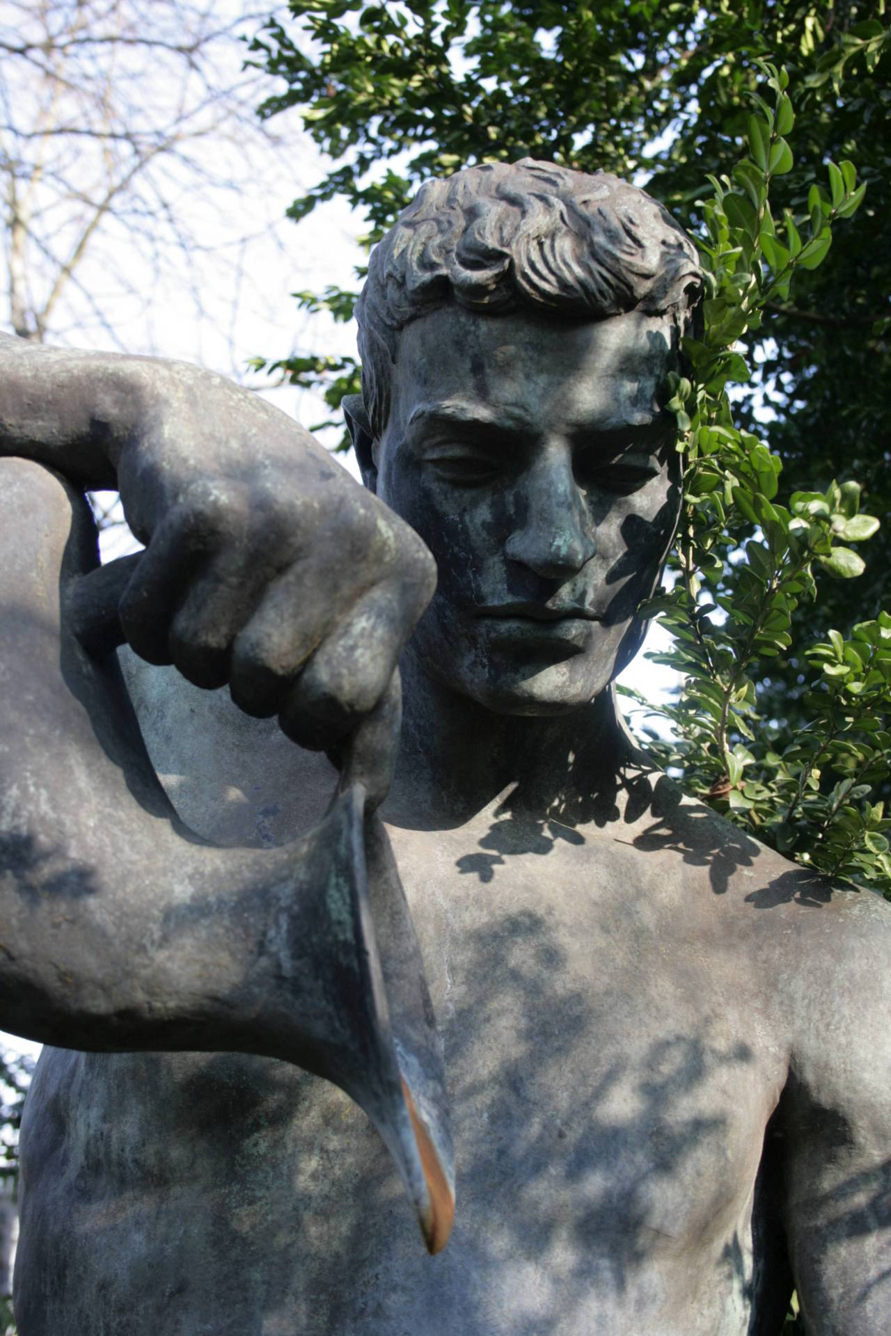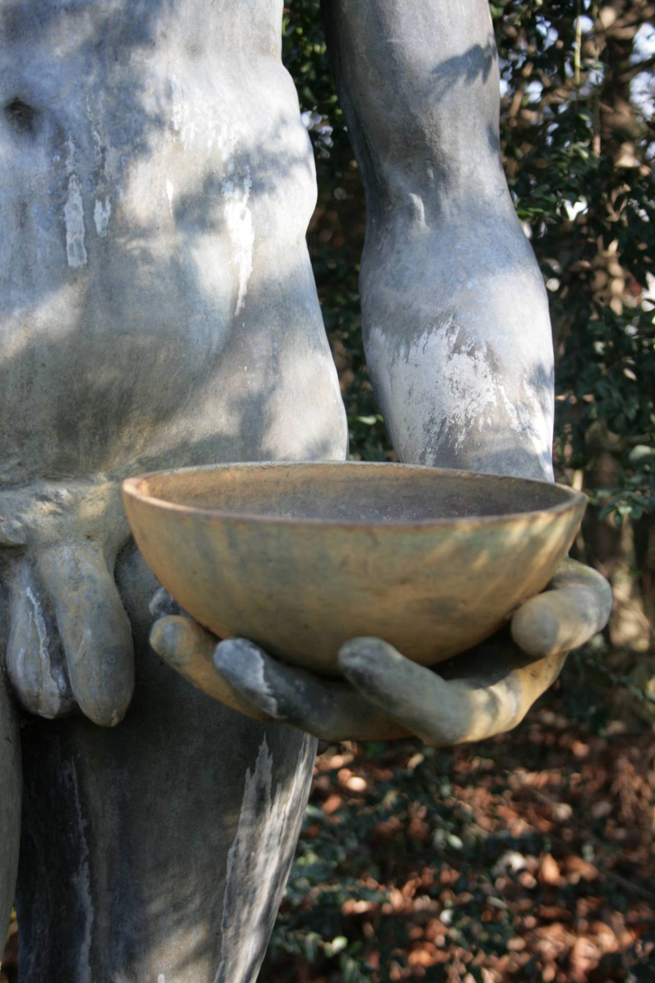 Am Beginn des kleinen Bachlaufs zum Teich steht auf einem Ziegelsockel über „Kalksteingebirge“ mit eiserner Deckplatte die idealgebildete muskulöse Aktfigur eines jungen Mannes. In der rechten Hand hält er eine Schale, mit der erhobenen Linken hält er eine Kanne, aus der – bei Brunnenbetrieb – Wasser in die Schale fließt (Susanne Kähler).