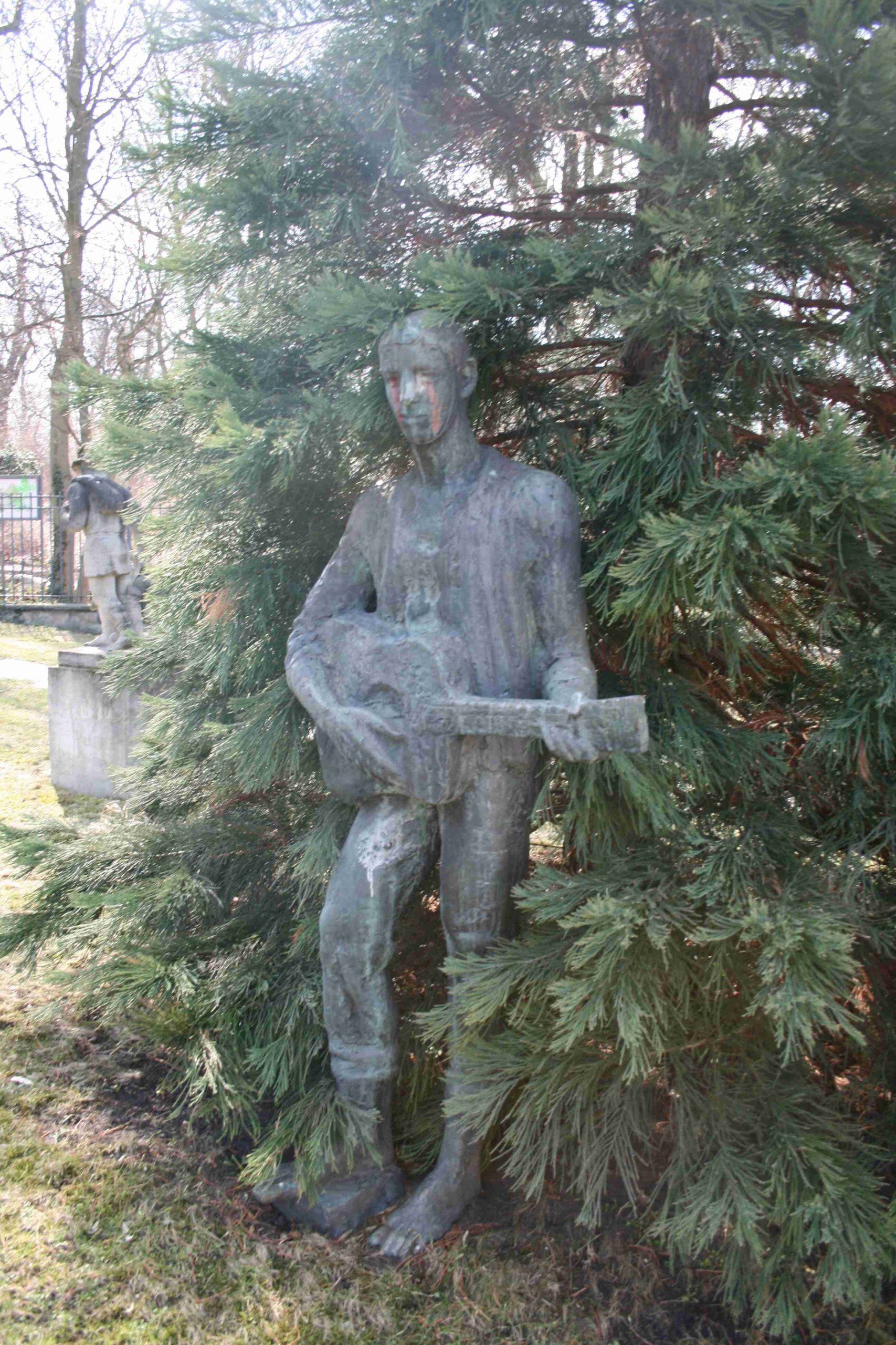 Auf kleiner, rechteckiger Plinthe steht mit nackten Füßen, dabei der rechte auf einem kleinen rechteckigen Block aufgesetzt, ein Gitarre spielender junger Mann in sommerlicher Bekleidung, bestehend aus Hose und einem vorne offen stehenden Hemd. Die Figur stand ursprünglich auf einem niedrigen rechteckigen Betonsockel (der auf dem Traveplatz erhalten ist) (Jörg Kuhn).
