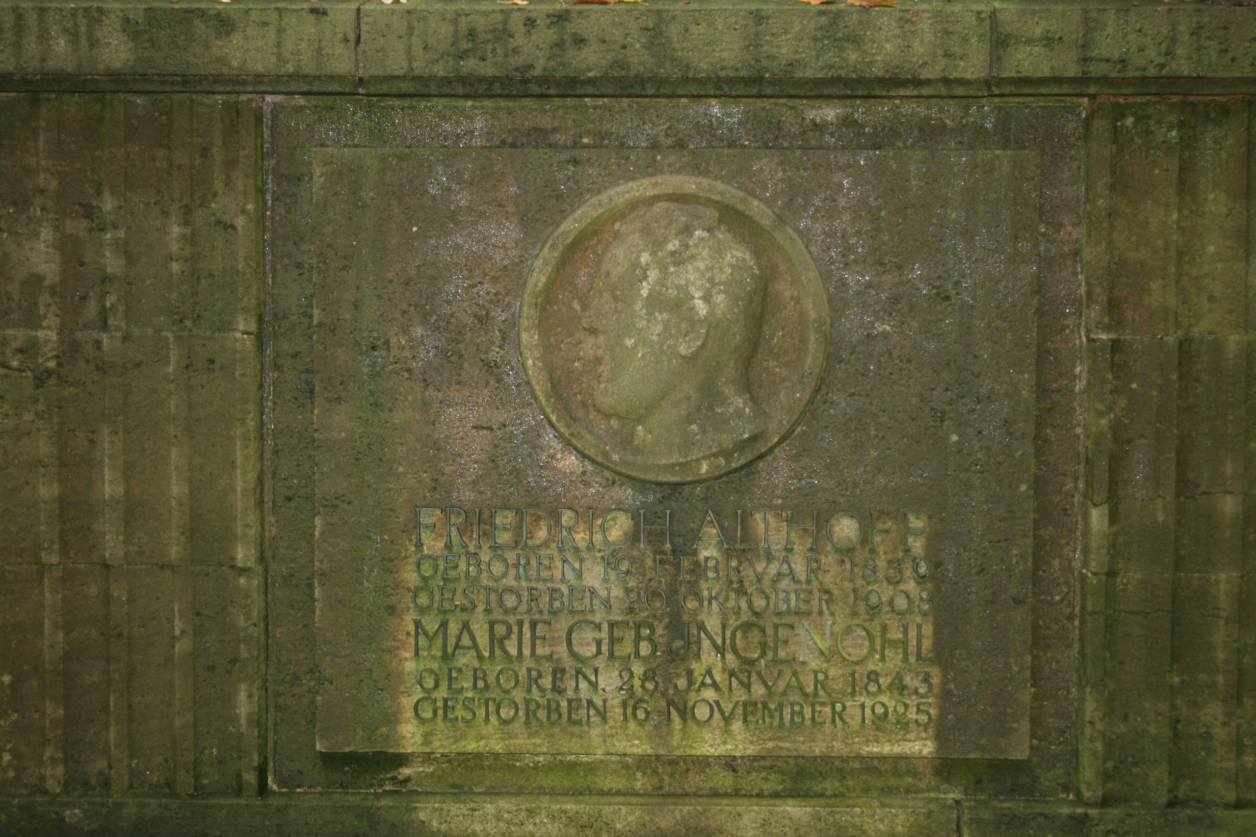 »FRIEDRICH ALTHOFF / GEBOREN 19. FEBRUAR 1869 / GESTORBEN 20. OKTOBER 1908 / MARIE GEB. INGENNOHL / GEBOREN 26. JANUAR 1843 / GESTORBEN 16. NOVEMBER 1925«