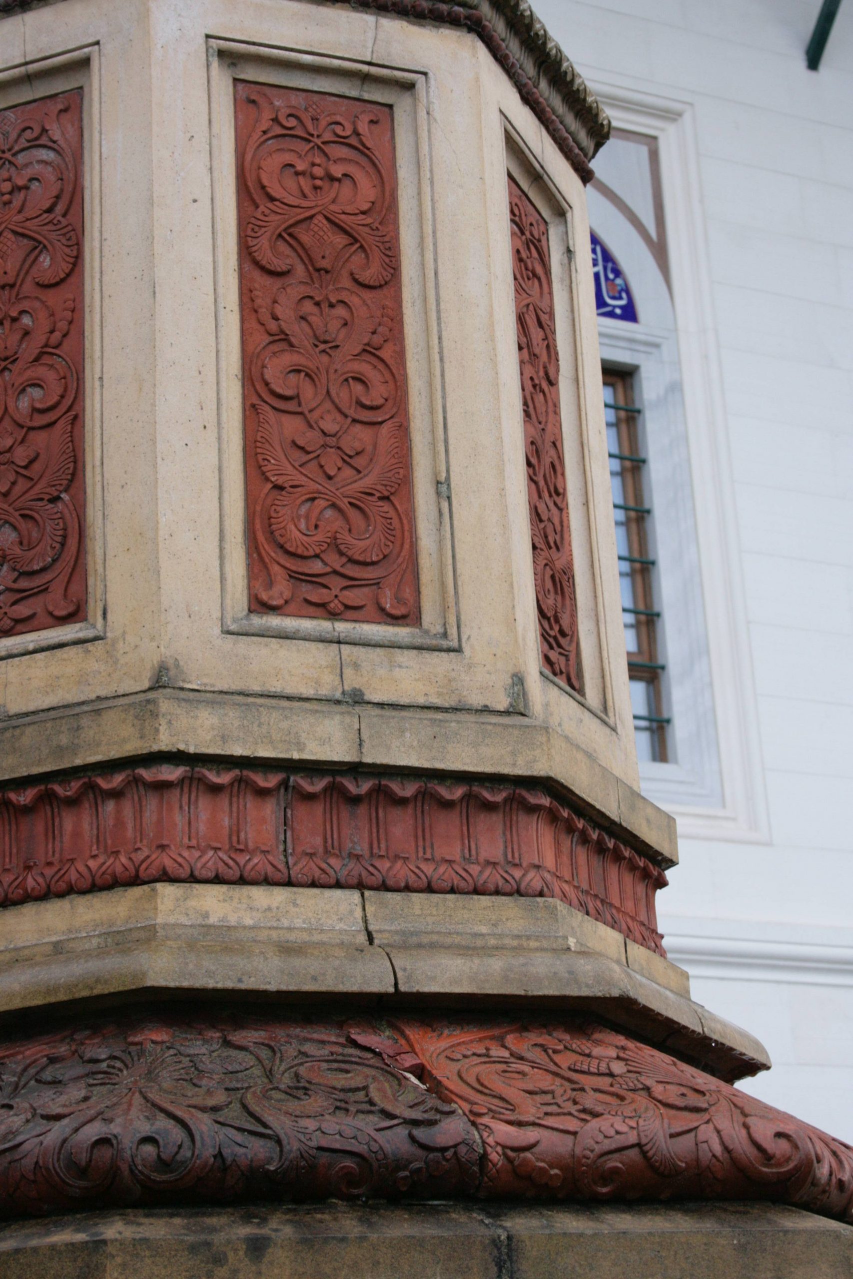 Auf einem polygonalen, gestuften Unterbau aus Granit erhebt sich der aus Terrakottastücken gelblicher Färbung zusammengesetzte Inschriftensockel mit seinen rechteckigen, in erhaben geformter, kalligraphisch gestalteten arabischer Schrift geschmückter Inschriftentafeln. Ein vorkargendes Gesims schließt den Inschriftensockel nach oben ab und leitet über zur polygonalen Basis des zweifarbigen Terrakottamonuments, der in der Literatur so genannten Säule. Ein mit hochrechteckigen Kassetten verzierter polygonaler Unterbau trägt darauf den polygonalen, durch spiralig aufsteigende Bänder aus gelblicher Terrakotta und aus durch vertikale Stäbe untergliederter rötlichbrauner Terrakotta besonders gestalteten Schaft – der nur von größerer Entfernung als rund erscheint. Der Schaft schließt mit einem polygonalen Kapitell in Gestalt einer Kopfbedeckung (?) ab, die wiederum die vergoldete Mondsichel als Symbol des Islams über goldfarbener Kugel trägt (Jörg Kuhn).