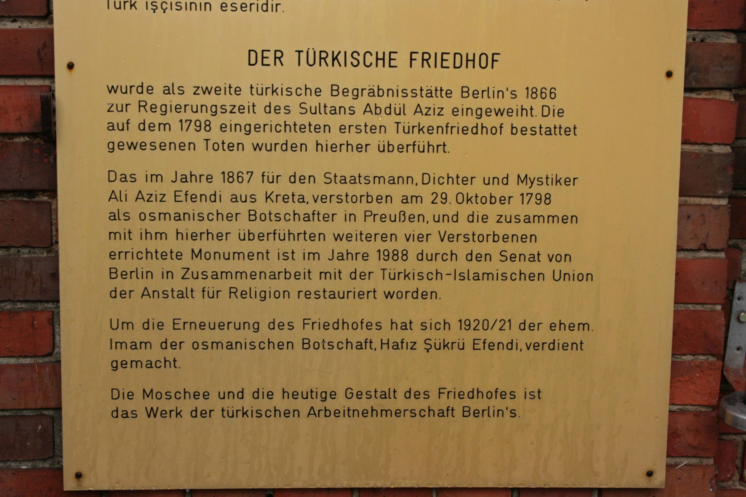 Der erste islamische Begräbnisplatz am Schlächtergraben (und den „Schlächterwiesen“) auf der Tempelhofer Feldmark (heute etwa Urbanstraße 15) wurde 1798 auf einem von König Friedrich Wilhelm III. dem Grafen Podewils für 40 Taler abgekauften Gelände eingerichtet. Anlass war der Tod des osmanischen Gesandten am preußischen Hof, Ali Aziz Efendi (gest. 29.10.1798), der hier feierlich in einer gemauerten Gruft beigesetzt wurde. 1804 folgte mit der Beisetzung des osmanischen Gesandten Mehmet Esad Efendi (gest. 28.4.1804) eine weitere Bestattung nach islamischem Ritus in der Gruft. 1836 wurden auf Weisung des preußischen Königs zwei Grabsteine mit Inschriften aufgestellt. Die Grabstätte erhielt im März 1838 eine Schwelleneinfassung aus Granit und ein eisernes Gitter. Am 29. August 1838 wurde hier der Kaiserlich Türkische Geschäftsträger Rahmi-Effendi beigesetzt. Der in Folge der seit 1854 von Kriegsminister Albrecht Graf von Roon vorangetriebenen Vergrößerung des preußischen Heeres notwendig gewordene Bau der Kaserne des Kaiser Franz Garde-Grenadier-Regiments Nr. 2 an der Blücherstraße, mit dem 1863 begonnen wurde, machte eine Verlegung der Begräbnisstätte notwendig. König Wilhelm von Preußen schenkte 1865 als Ersatz ein zur Hasenheide gehöriges Gelände am heutigen Columbiadamm, unweit des „Dennewitz-Friedhofes“. Am 19.12.1866 wurden die sterblichen Überreste der Toten vom alten auf den neuen Friedhof überführt. 1867 ließen König Wilhelm und Sultan Abdül-Aziz (auch: Abdul Aziz Khan) ein prächtiges Gedenkmal für diese Toten errichten. Den Entwurf lieferte Gustav Voigtel, der auch ein heute nicht mehr erhaltenes Eingangsportal im „maurischen Stil“ entwarf. Das im Zweiten Weltkrieg beschädigte zentrale Grabmonument wurde 1951 vereinfachend wiederhergestellt. Im Zusammenhang mit der 750-Jahr-Feier Berlins 1987 erfolgte eine grundlegende Sanierung unter Leitung des Architekten Christoph Fischer, dem Restaurator Artur Kratz und dem Keramiker Ulrich Wagner. Die ehemals beherrschende Stellung des zentralen Grabmonuments, die schon durch die um 1982 erfolgte Errichtung eines massigen Minaretts weitgehend verloren gegangen war, wurde durch den 1999-2004 erfolgten Bau der neuen Sehitlik-Moschee zerstört. Die um 1955 errichtete Einfassungsmauer des Friedhofs zum Columbiadamm wurde 2015 durch eine neue Mauer mit Brunnenwand und zwei Eingangstoren ersetzt. Durch die Anlage des nordöstlichen Tores wurde jedoch die nach 1938 verloren gegangene Beziehungsachse zwischen zentralem Grabmonument und der von Augst Stüler entworfenen Gedächtnishalle auf dem benachbarten "Dennewitz-Friedhof" im ehem. Neuen Garnisonfriedhof (heute: Friedhöfe am Columbiadamm) ansatzweise wieder nachvollziehbar gemacht (Jörg Kuhn).