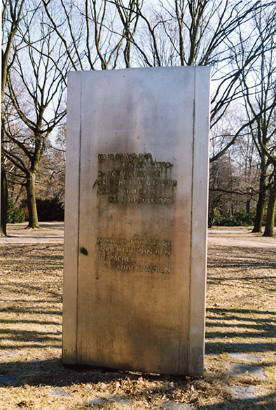Die flache Stele mit geschwungenem Grundriss und matter Oberfläche steht, nur wenig vom Boden erhöht, auf zwei Füßen aufgeständert. Die Bodenfläche wird durch eine Schieferpflasterung gebildet. Auf der Vorderseite in Bereich der oberen Hälfte der Stele ist ein stilisiertes aus Stahlplatten gefertigtes Auge angebracht. Vor- und Rückseite sind mit Inschriften versehen. Inschriften teils mit applizierten Lettern gestaltete. Die Lettern sind teilweise weiß poliert (Jörg Kuhn, Susanne Kähler).