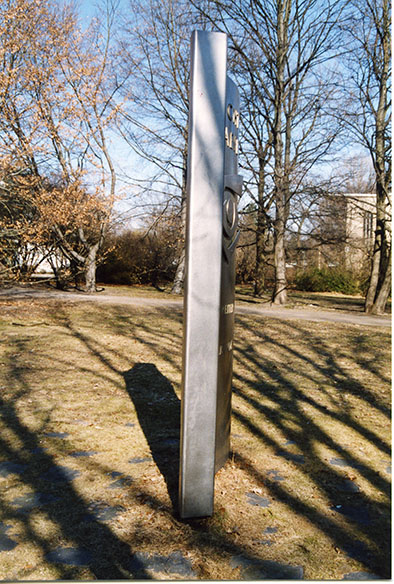 Die flache Stele mit geschwungenem Grundriss und matter Oberfläche steht, nur wenig vom Boden erhöht, auf zwei Füßen aufgeständert. Die Bodenfläche wird durch eine Schieferpflasterung gebildet. Auf der Vorderseite in Bereich der oberen Hälfte der Stele ist ein stilisiertes aus Stahlplatten gefertigtes Auge angebracht. Vor- und Rückseite sind mit Inschriften versehen. Inschriften teils mit applizierten Lettern gestaltete. Die Lettern sind teilweise weiß poliert (Jörg Kuhn, Susanne Kähler).