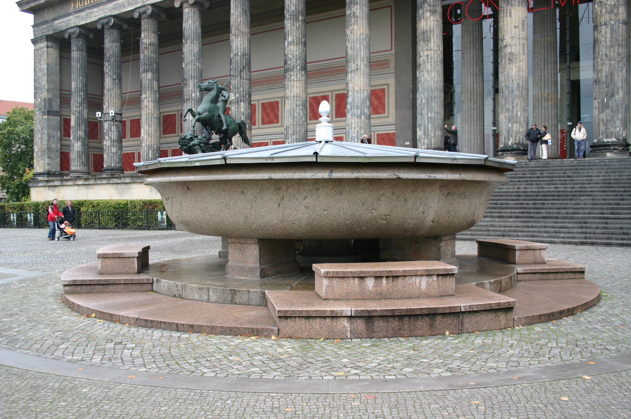 1826 bestellte König Friedrich Wilhelm III. bei dem Bauinspektor und Steinschleifereiinhaber Christian Gottlieb Cantian (1794-1866) eine Prachtschale aus Granit. K. F. Schinkel beabsichtigte nun, die Schale in der Rotunde des von ihm entworfenen Museums am Lustgarten aufzustellen und zwar nach dem Vorbild der römisch-antiken Granitschale in der Sala Rotonda in den Vatikanischen Museen. Cantian ließ 1827 für die Schale einen riesigen roten Granitfindling, einen der beiden eiszeitlichen „Markgrafensteine“ in den Rauhener Bergen bei Fürstenwalde, spalten und den grob vorgefertigten und einseitig ausgehöhlten Rohling bis Ende 1828 nach Berlin schaffen. Die nach dem aufwändigen Schleifen und Polieren gegenüber der ersten Planung um einiges größer geratene Schale von über 70 Tonnen Gewicht und von 22 Fuß im Durchmesser war für die Museumsrotunde zu gewaltig geraten und Schinkel erreichte 1829 beim König die Erlaubnis, die Schale vor dem Museum aufzustellen. Am 14.11.1831 konnte die monolithe Schale auf einem provisorischen Sockel aufgestellt werden. Die endgültige Übergabe der nun auf drei massiven Sockelblöcken ruhenden Schale, deren Inneres, durch die Nutzung von drei Stufensteine auf dem Standpodest (aus französischem Rose de la Clarté-Granit), eingesehen werden konnte, erfolgte am 10.11.1834. Eigentümer des 33.386 Taler teuren Werkes war nun das Kgl. Museum (heute: Staatl. Museen zu Berlin Preußischer Kulturbesitz). 1934 wurde die Schale nördlich der Denkmalkirche des Berliner Domes aufgestellt. 1981 wurde sie an ihre ursprüngliche Stelle zurückgebracht (der Lustgarten war damals ein Teil des Marx-Engels-Platzes), wobei die von Witterungs- und Kriegsschäden betroffene Schale zerbrach und zusammengefügt werden musste (Jörg Kuhn). Zwischen 1997 und 1999 wurde die Schale erneut restauriert, wobei der graue Lausitzer Granit des Sockels durch den rötlichen Reose de la Carté-Granit ersetzt wurde (vgl.Schroeder, Naturwerksteine 2006, S.119f.)