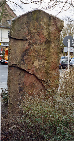 grob geglättete Stele aus rötlich geflecktem Granit, an der Front in einer Art Längsnische geschliffen und poliert.