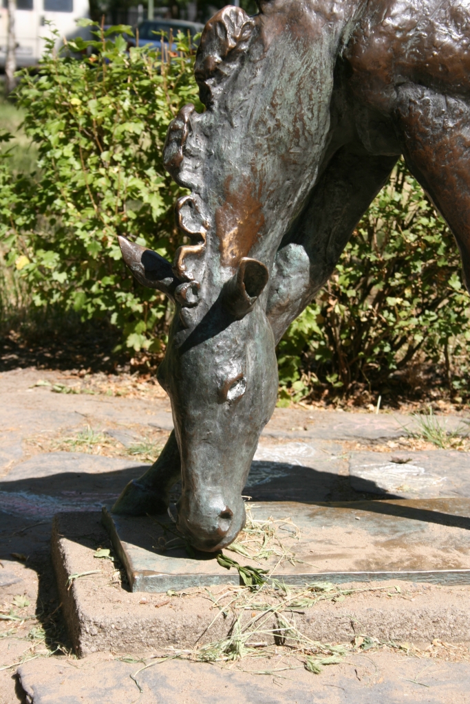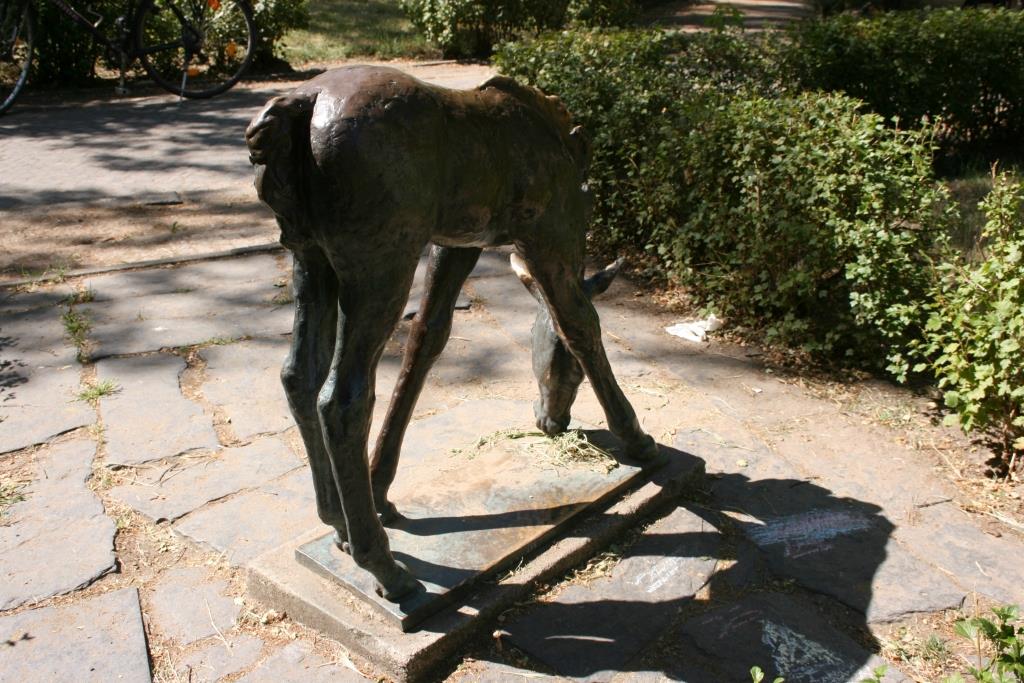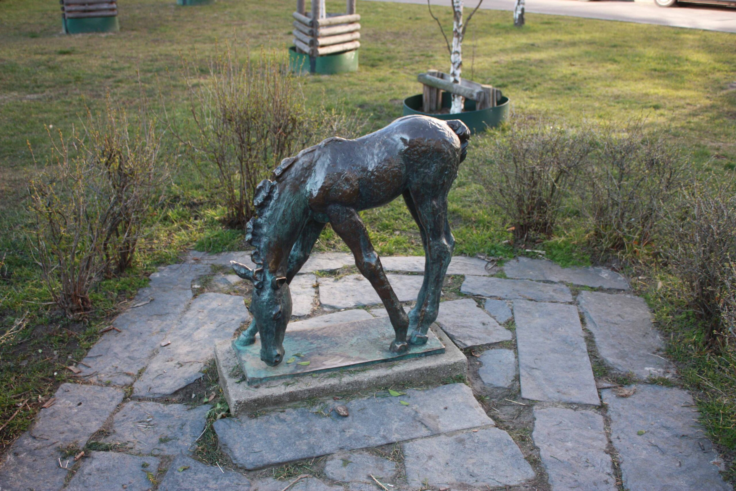 auf flachem Betonsockel steht auf rechteckiger Plinthe die naturalistisch formulierte Bronzeplastik eines grasenden Fohlens