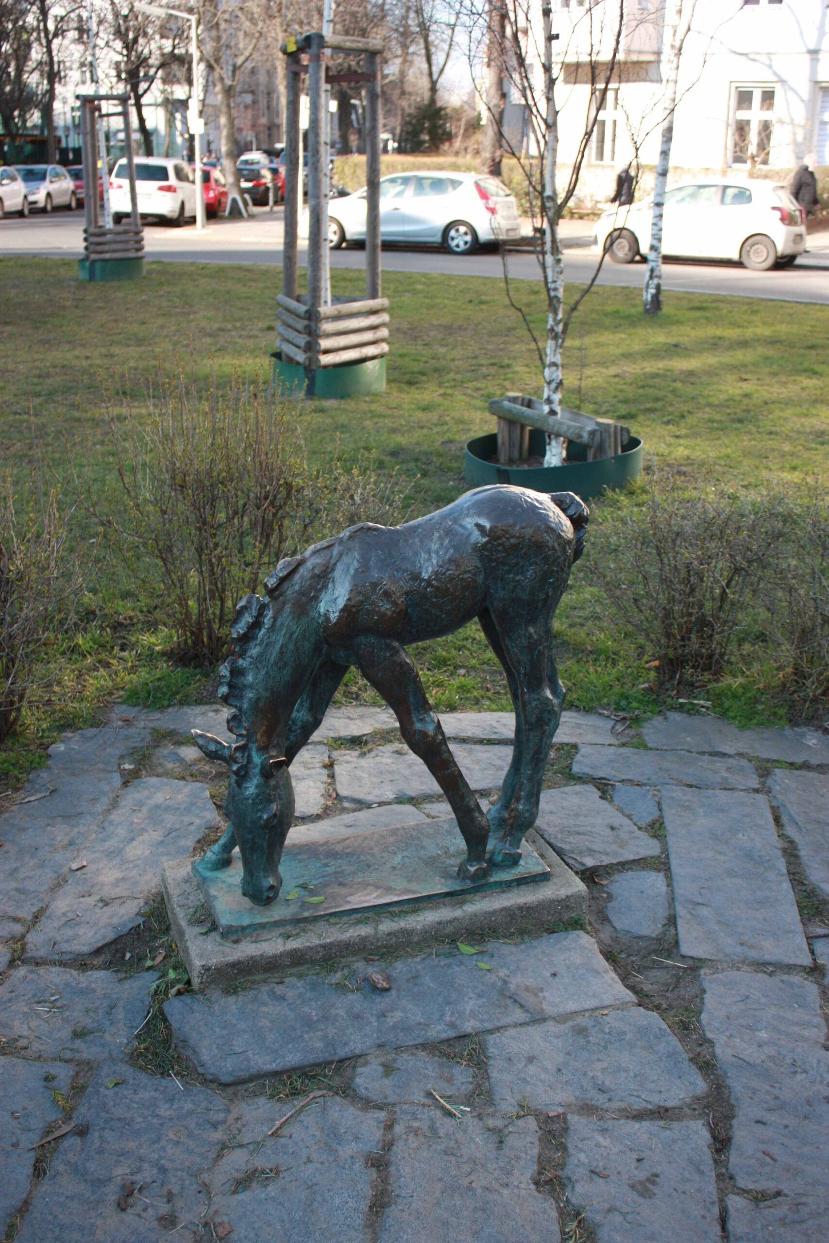 Die 1929 entstandene Figur eines grasenden Fohlens wurde zwischen 1970 und 1971 auf dem 1955 nach Plänen von Karl-Heinz Tümler neu gestalteten Platz aufgestellt. Der ehemalige „Wilmersdorfer Platz“, seit 1967 „Renée-Sintenis-Platz“ gehört zum ältesten Siedlungskern der Kolonie Friedenau. Die schönlinige Plastik „Grasendes Fohlen“ von 1929, gestaltet in einem zurückhaltend formulierten Naturalismus, verleiht dem stillen Platz eine besondere Prägung. Ein weiteres Exemplar der Tierfigur steht in Düsseldorf im Hofgarten (Jörg Kuhn, Susanne Kähler).