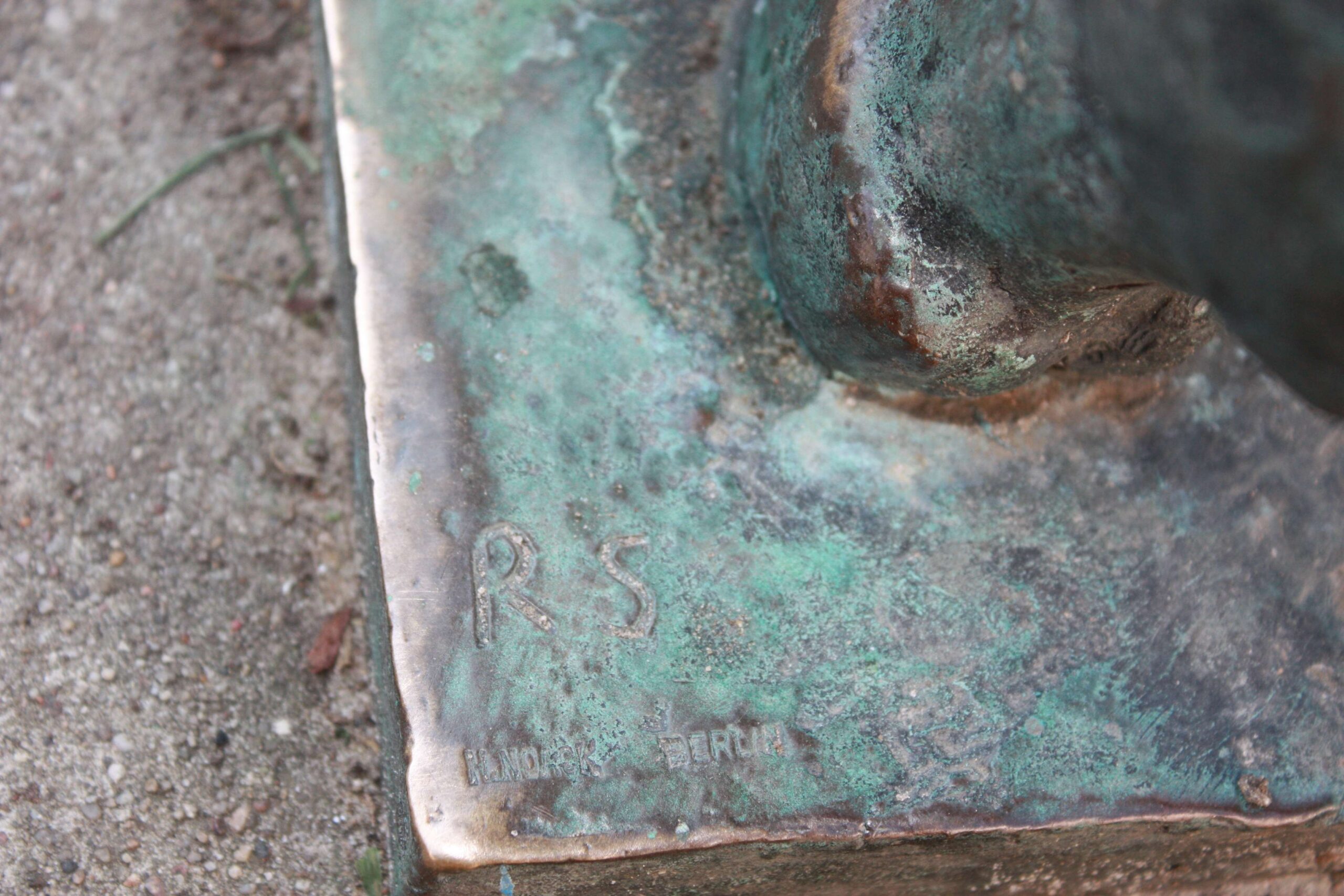 auf flachem Betonsockel steht auf rechteckiger Plinthe die naturalistisch formulierte Bronzeplastik eines grasenden Fohlens