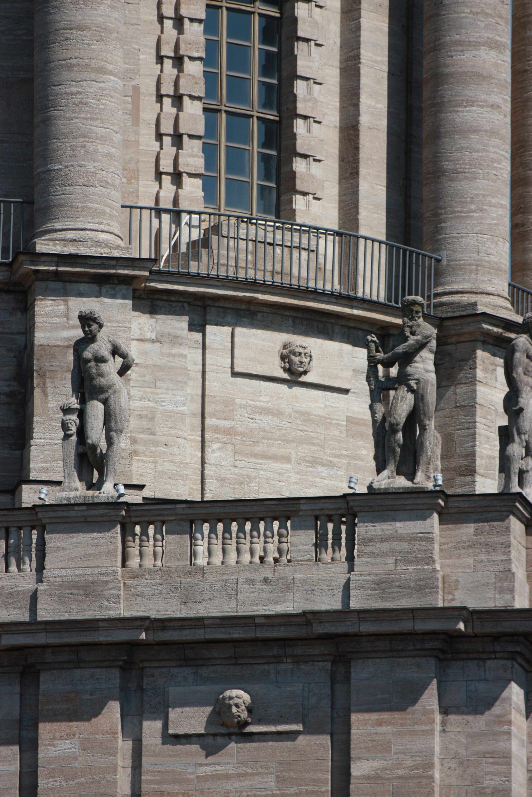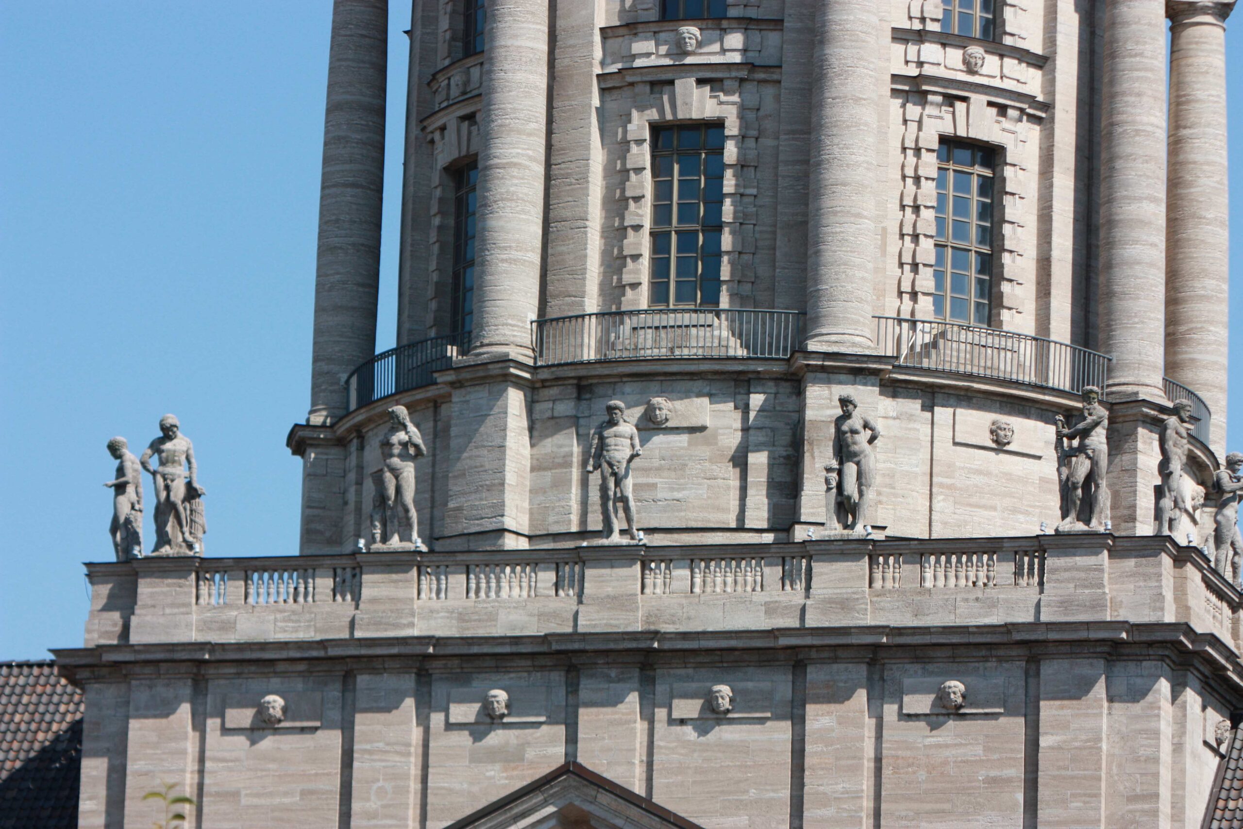 Auf der Attika des Turmunterbaus des Alten Stadthauses stehen elf überlebensgroße Statuen, drei männliche und zwei weibliche an der Frontseite zur Jüdenstraße sowie jeweils eine männliche und eine weibliche auf den seitlichen Attikaflächen und zwei zum Innenhof (Nicola Vösgen).