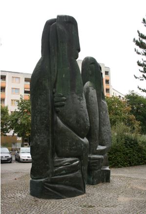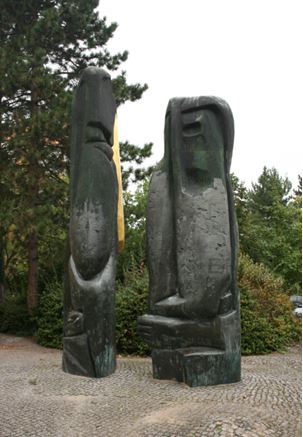 Skulpturengruppe. Der Bereich, auf welchem das Kunstwerk aufgestellt ist, zeigt einen wellig gestalteten Grund mit Granitpflasterdeckung. Das Kunstwerk ist zweiteilig und in Bronze gegossen. Die beiden stark abstrakt gestalteten Plastiken zeigen humanoide Formen mit großen Köpfen. Sie sind als Kopffigur und als stehende Figur mit Gewändern zu erkennen. Einzelne Details erinnern an Augen und Münder. Die Plastiken sind sorgfältig dunkel patiniert und an verschiedenen, plastisch betonten Bereichen goldfarben gefasst (Jörg Kuhn, Susanne Kähler).
