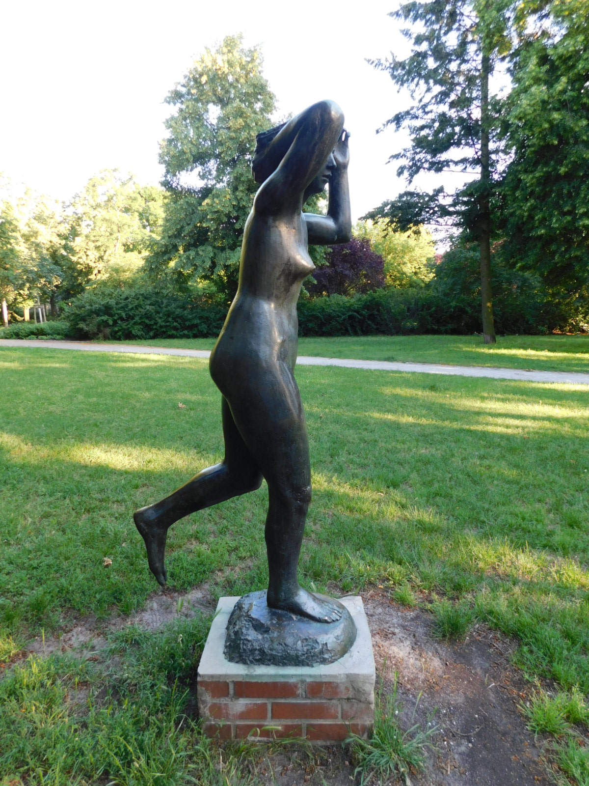 Es handelt sich allansichtige Voll- und Freiplastik aus Bronze auf einem Klinkersockel. Dargestellt ist eine laufende nackte Frau mit erhobenen angewinkelten Armen.