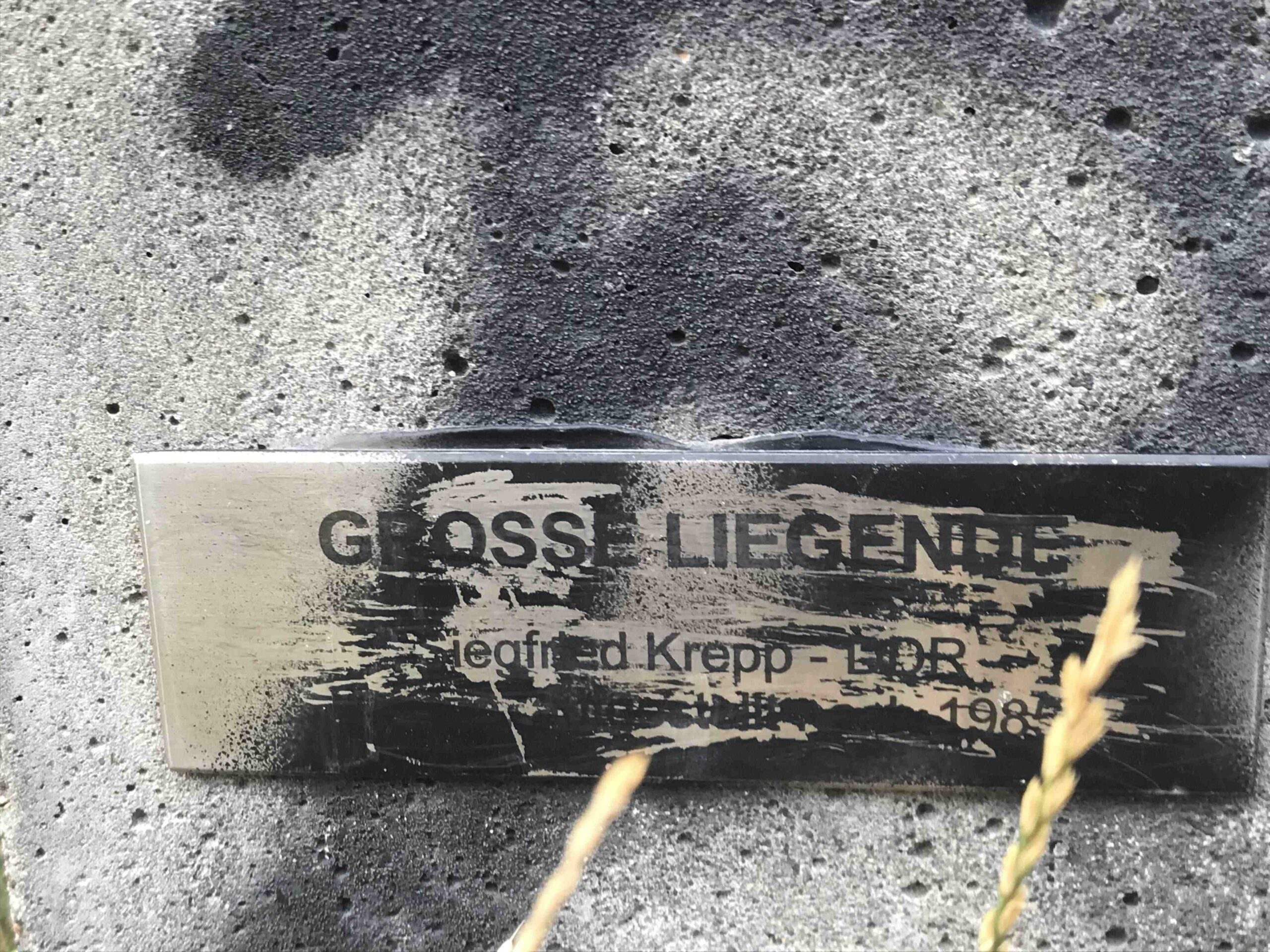 Der Sockel trägt ein Metallschild an der östlichen Schmalseite unten links: „GROSSE LIEGENDE / Siegfried Krepp – DDR / Bronze, aufgestellt nach 1985“ (Nicola Vösgen).