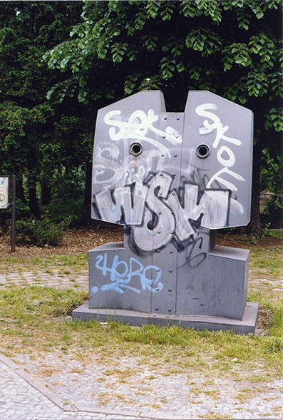 Die Standfläche des Objekts wird durch eine rechteckige Plinthe gebildet. Zu beschreiben ist es als eine monumentale stilisierte Büste, d. h. Schulterpartie, Hals und Kopf wurden mit kubischen harten Formen angedeutet, die stark vereinfachten menschlichen Formen in eine technizistische Formensprache übersetzt. Der Umriss dieser Büste teilt sich an der Oberseite durch einen sich in der Mitte befindlichen keilförmigen Einschnitt in zwei Hälften. An beiden Seiten teilt zudem ein von oben bis herab zur Plinthe verlaufendes flaches Stahlband mit je 22 6-Kant Schrauben das Objekt in eine rechte und eine linke „Gesichtshälfte“. Vorder- und Rückseite des sich in der Tiefe nach oben verjüngenden Objekts sind nahezu identisch gestaltet. Zwei runde Löcher mit erhabenem Rand stehen Anstelle der Augen, weitere Details eines Gesichts wurden nicht angedeutet, die Oberfläche ist ansonsten glatt belassen worden. In ihrer Presseerklärung („Dokumentation der Bildhauergruppe „Glyptiker“, Archiv beschrieb der Künstler sein Werk als „Kopffigur – Figurenkopf, reduzierte Formenmerkmale des menschlichen Körpers“). (Kähler/Kuhn)