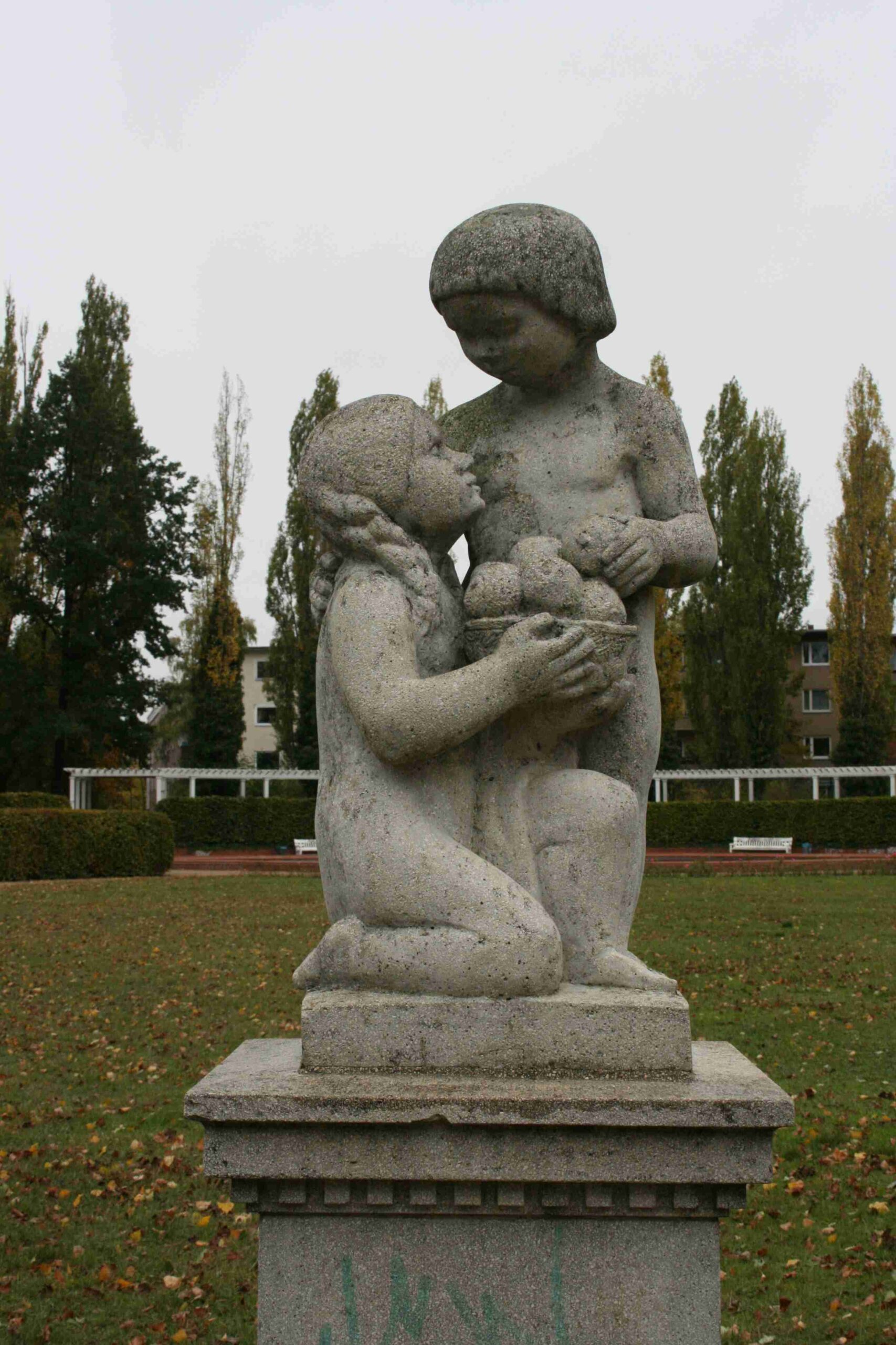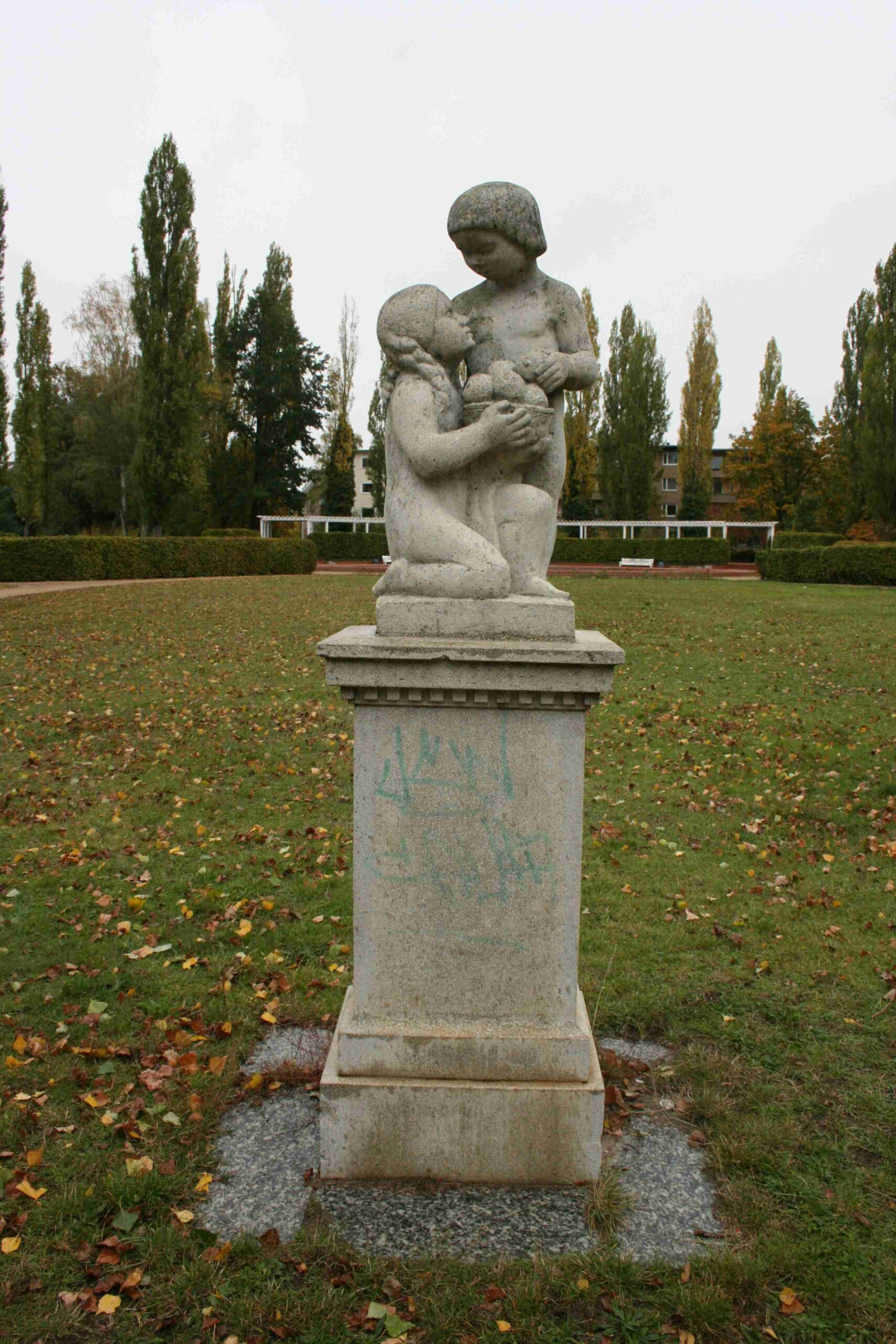 Grünanlage in geometrischen Formen im Sinne eines späten, neubarocken Jugendstils (Reformkunst). Am westlichen Rand steht das neoklassizistische „Parkhaus“, dem in östlicher Lage eine weißgefasste Pergola aus Holz entspricht. Besonderer Schmuck des Parkes sind zwei zweifigurige Puttengruppen (Kniendes Mädchen, stehender Knabe; Knabe mit Reh) auf Sockeln und ein neubarockes Brunnenbecken mit einer bogig geschweiften Einfassung in rotem Klinkermauerwerk. Die etwas teigig-steif formulierten Puttengruppen erinnern entfernt an die 1911-13 entstandenen Märchenfiguren am Märchenbrunnen im Friedrichshain, dürften jedoch spätere Nachschöpfungen sein.