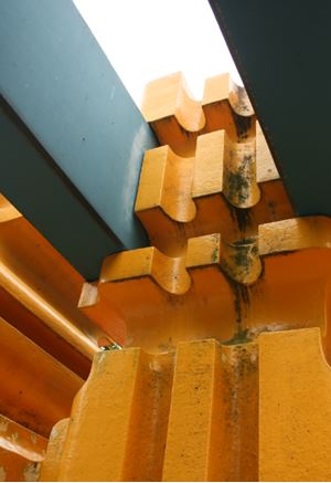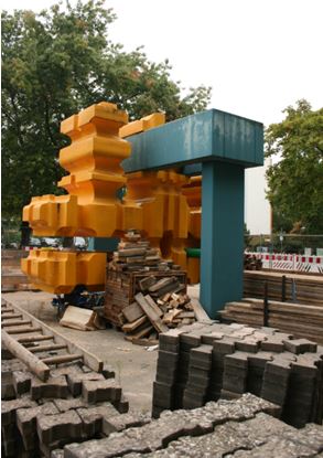 Monumentale abstrakte und technizistische Skulptur aus Beton und Glasfaser (Polyurethan; Kunstharz) in den Farben blau und orange (heute eher blaugrün/petrol und sonnengelb). Die Glasfaserkörper hängen innerhalb eines Betonrahmens. Das Kunstwerk korrespondiert mit seinem geometrischen Aufbau mit den Bauformen der GSW-Hochhausanlage. „In einen torartigen, blauen Betonträger sind orangefarbene, konkav-konvex gewellte Glasfaser-Kunststoffelemente (…) eingehängt“ (Endlich, 1990, S. 107).
