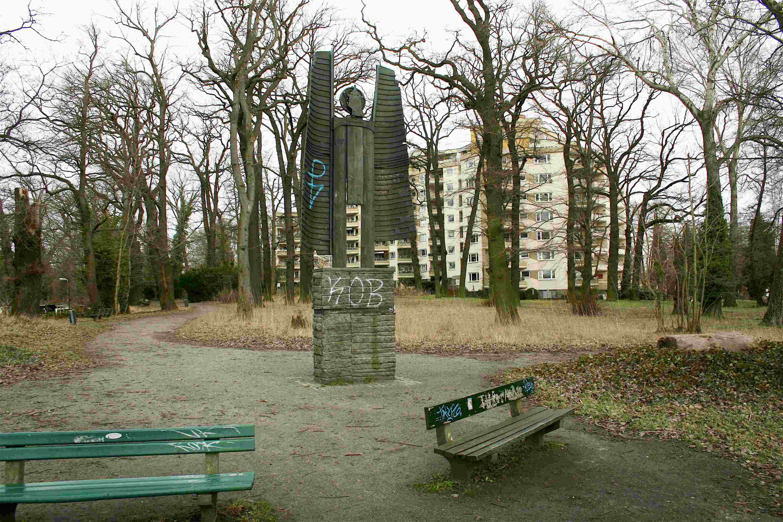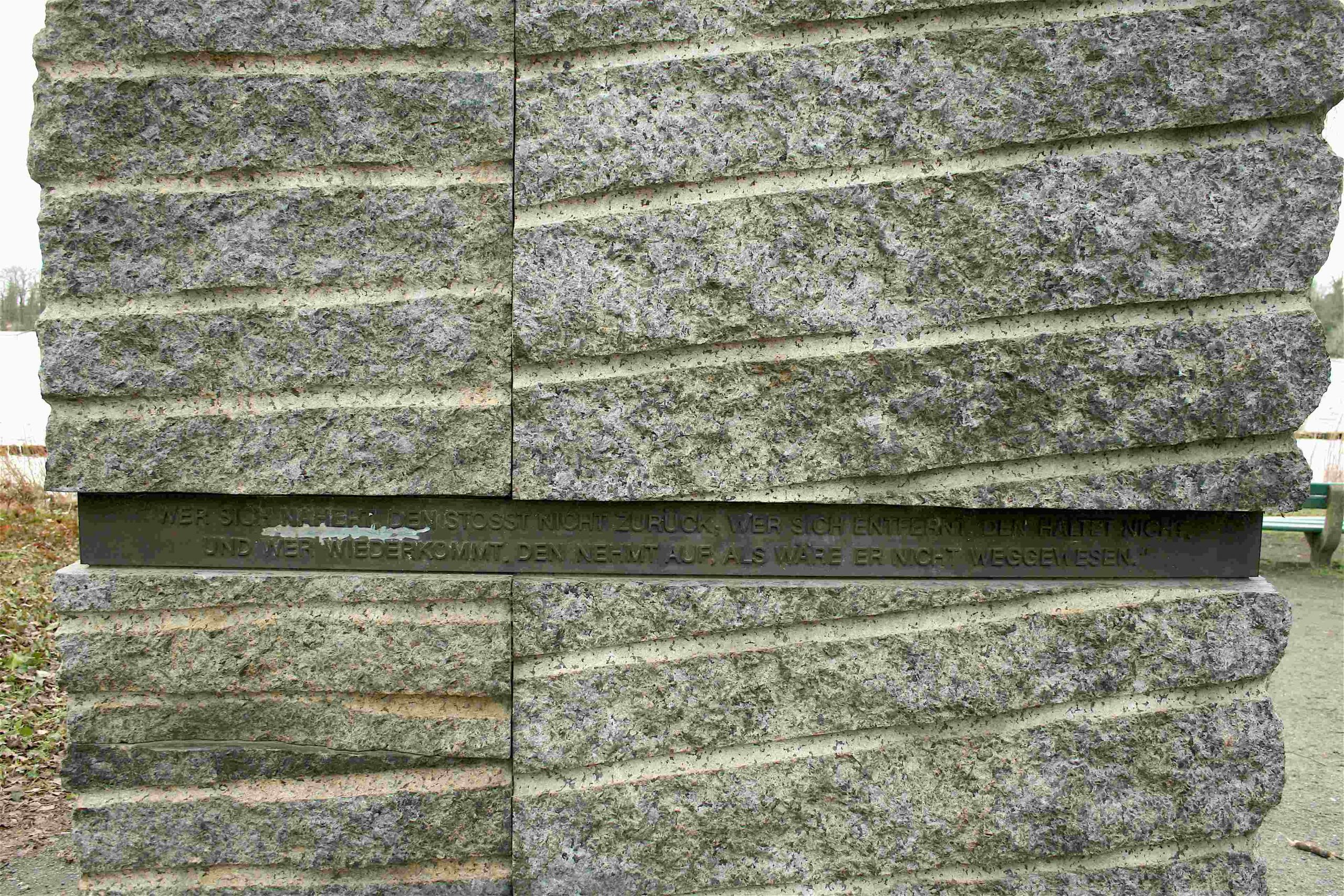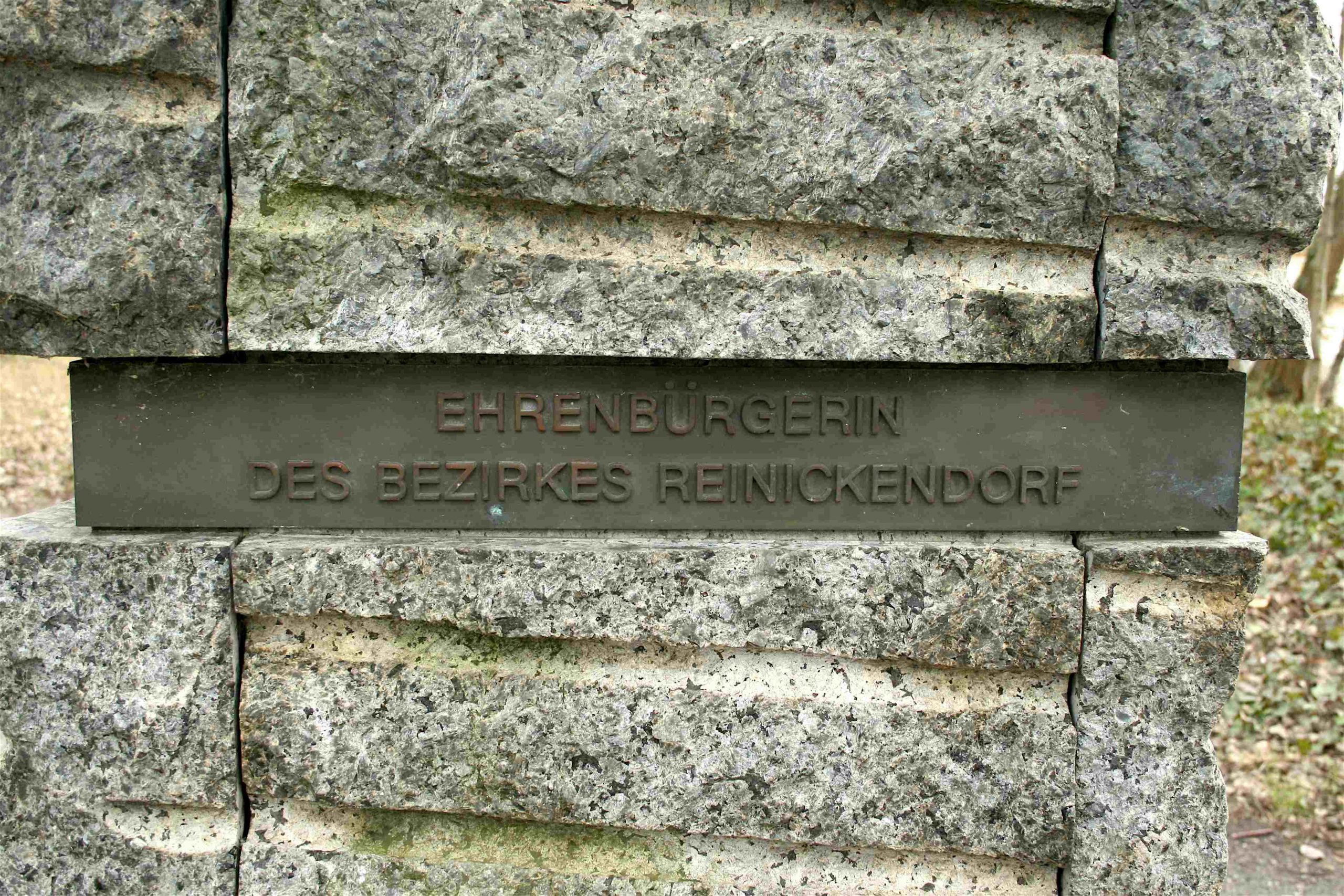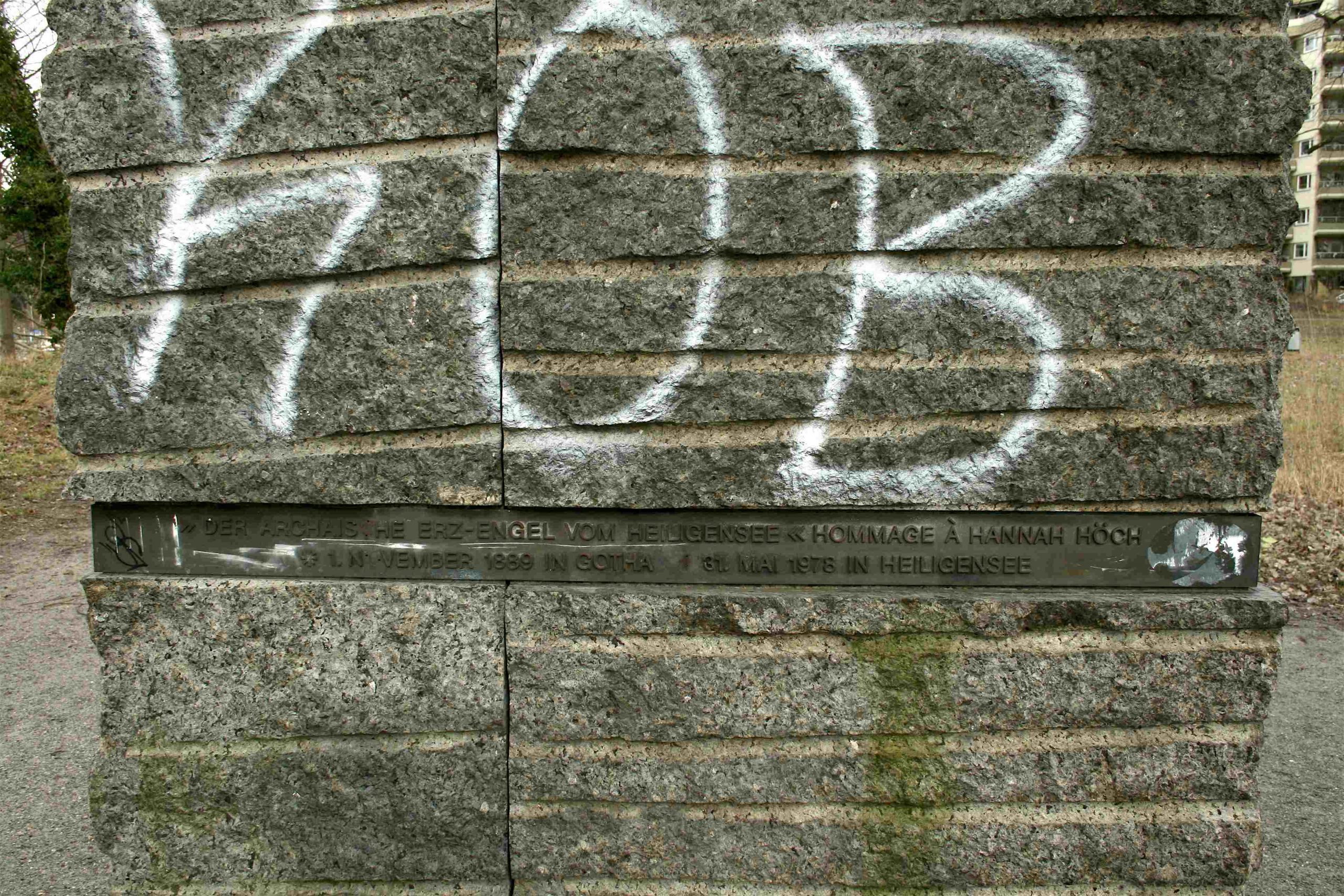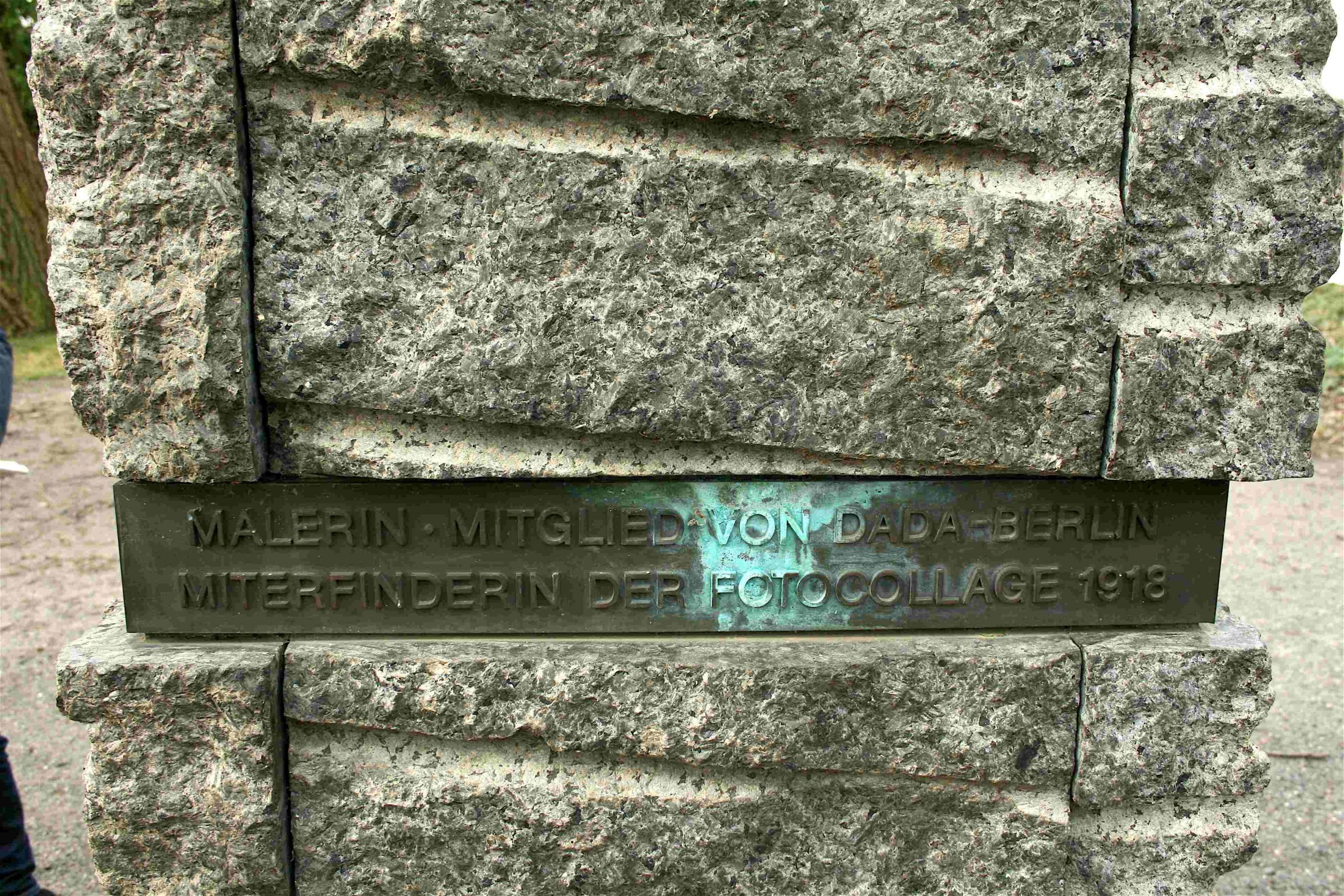 »(Tafel I) »DER ARCHAISCHE ERZ-ENGEL VOM HEILIGENSEE« HOMMAGE À HANNAH HÖCH / *1. NOVEMBER 1889 IN GOTHA +31. MAI 1978 IN HEILIGENSEE; (Tafel II) MALERIN ⋅ MITGLIED VON DADA-BERLIN / MITERFINDERIN DER FOTOCOLLAGE 1918; (Tafel III) EHRENBÜRGERIN / DES BEZIRKS REINICKENDORF; (Tafel IV) “WER SICH NÄHERT, DEN STOSST NICHT ZURÜCK; WER SICH ENTFERNT, DEN HALTET NICHT. / UND WER WIEDERKOMMT, DEN NEHMT AUF, ALS WÄRE ER NICHT WEGGEWESEN.“«