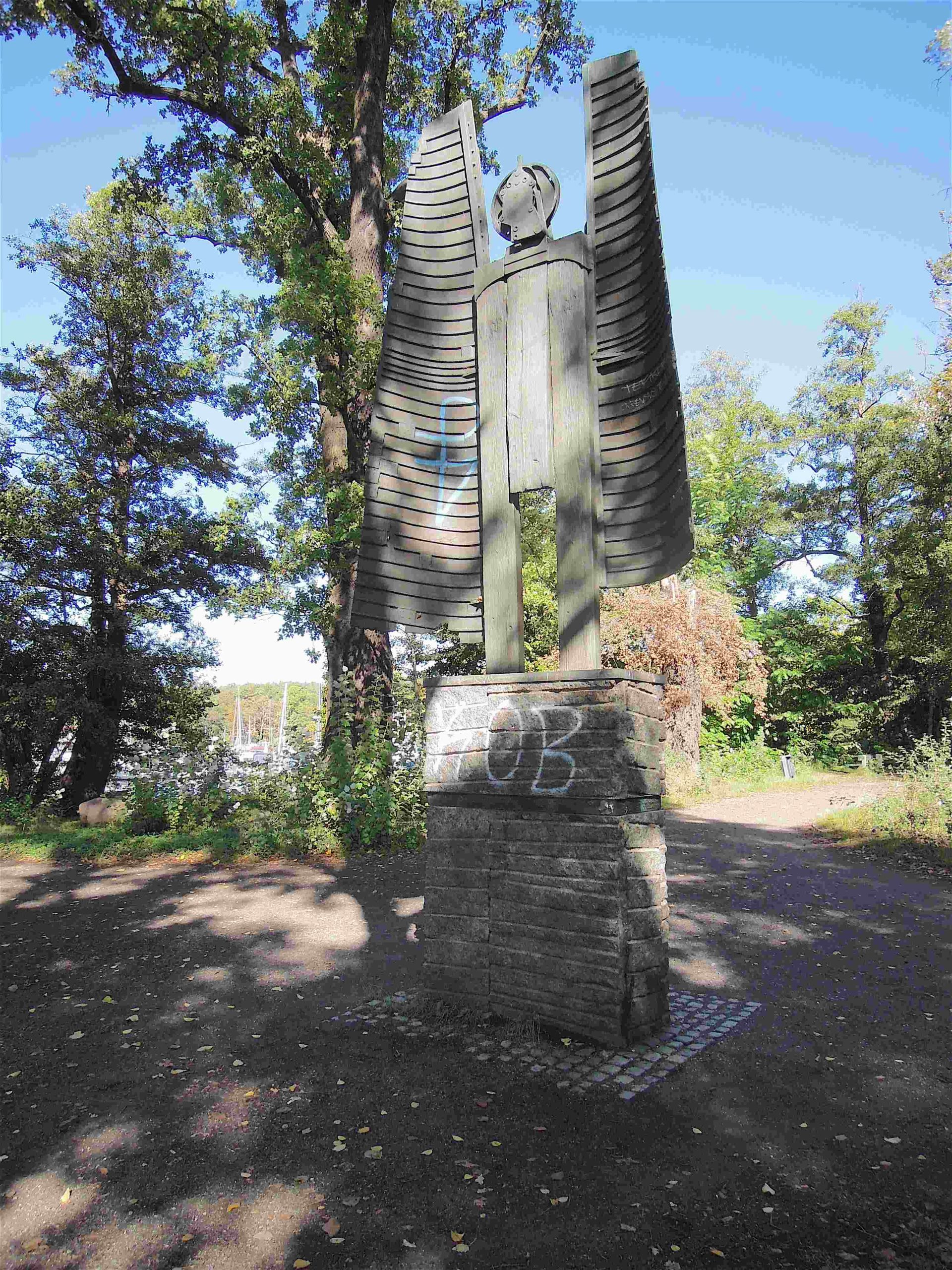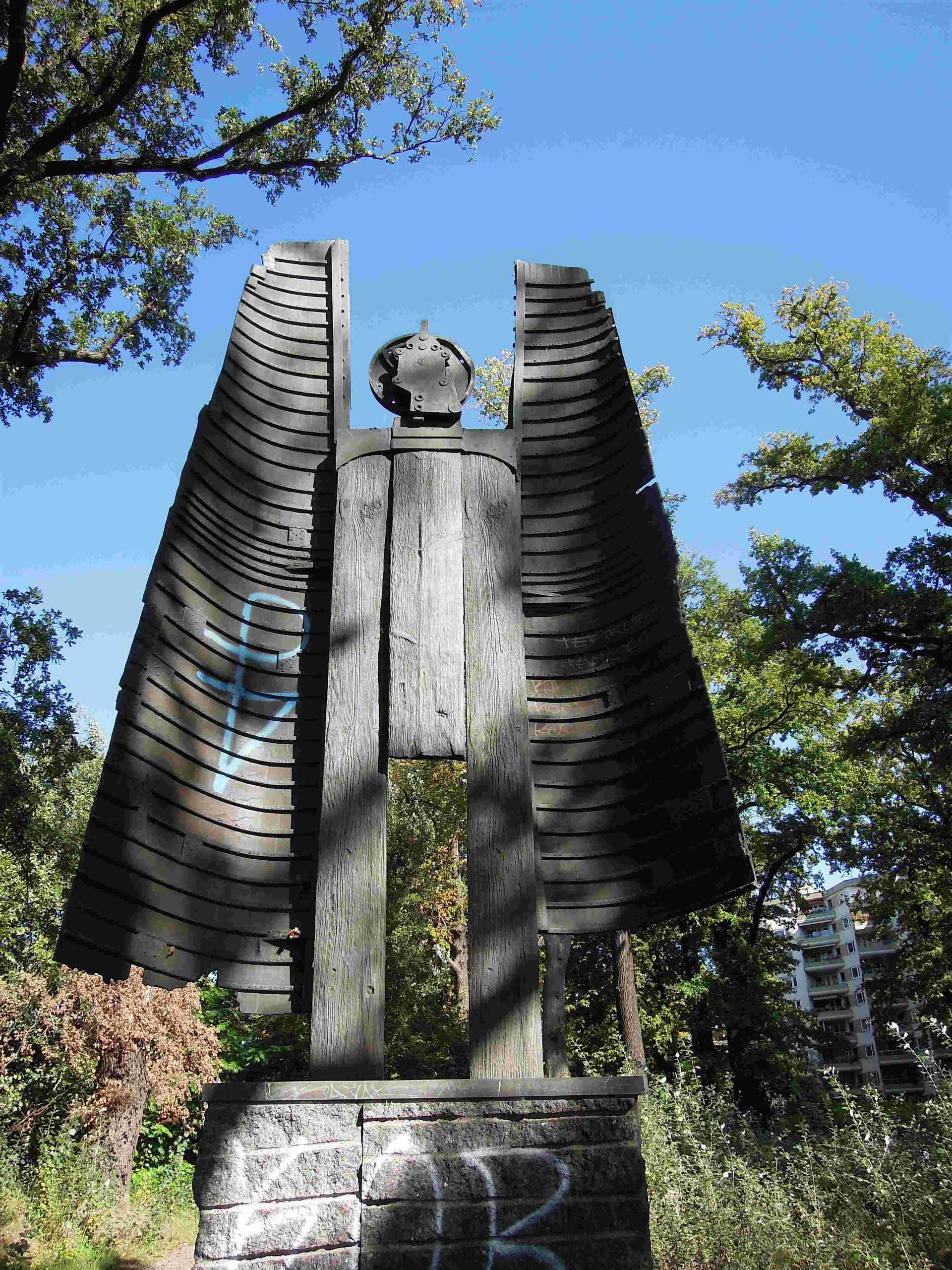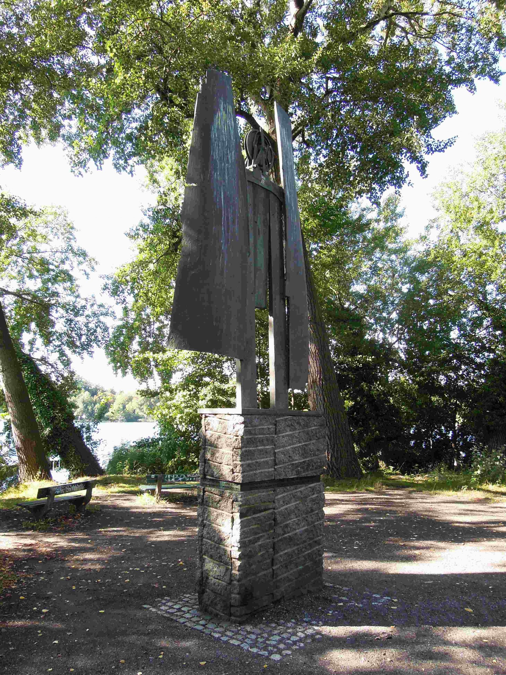 Die Bronzeplastik des „Archaischen Erzengels“ bzw. das „Hannah-Höch-Denkmal“ zeigt einen Engel in abstrahierter und vereinfachter Form und ist der Abguss eines Collage-Kunstwerks, das Siegfried Kühl aus realen Fundstücken aus dem See, wie Bootsplanken und Holzbohlen (als Flügel und Körper) sowie einem Stellrad von der S-Bahn (als Kopf) zusammengefügt hatte. Die Struktur und Materialität dieser Werkstoffe ist in der Skulptur deutlich ablesbar. Der Sockel hat einen Stahlbetonkern, der mit grob bearbeiteten, dunklen Natursteinplatten, aus sog. Labrador-Granit verkleidet ist. Die Granit-Verkleidung ist durch ungerade verlaufende, vertiefte Linien (Bohrspuren) durchzogen. Die Bohrspuren vom Steinabbau wurden belassen, sie geben dem Sockel Struktur. Die Bodenplatte der Plastik ist über den etwa 200 cm hohen Sockel gestülpt, und schützt ihn so vor Witterungseinflüssen.In etwa 130 cm Höhe ist umlaufend ein 8 cm hohes, beschriftetes Bronzeband in den Sockel eingelas-sen. Die Schrift ist aus Einzelbuchstaben aufgesetzt. (Jürgen Tomisch, Barbara Anna Lutz).
