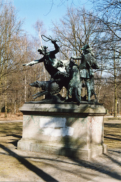 Bronzene Figurengruppe auf hohem rechteckigen Sockel aus Muschelkalkstein. Dargestellt ist in veristischer Gestaltung eine Hasenhetze aus der Zeit um 1750. Die „Hasenhetze“ zeigt den Beginn der Hasenjagd. „Mit der Hetzpeitsche in der Hand weist der Jagdherr dem einen der Hunde (russischer Steppenhund) den Weg, während der zweite in seinem Jagdeifer durch den Piqueur kaum noch gezügelt werden kann“ (Müller-Bohn, 1905, S. 73). Der jüngere und körperlich kleinere „Piqueur“ rechts in der Gruppe hält der rechten der beiden Jagdhunde kurz an der Leine. Der Hund steht auf seinen Hinterläufen, den Körper stark bewegt nach oben gerecht. Der „Piqueur“ trägt an seinem Jagdgürtel einen erlegten Hasen, dessen Hinterläufe zusammengebunden sind und der so mit dem Kopf nach unten parallel zur Figur des Jägers herabhängt. Die beiden mit der berufsgemäßen Kleidung von höfischen Jagdleuten aus der Mitte des 18. Jahrhunderts gekleideten Jäger stehen mit den stark bewegt dargestellten begleitenden Hunden auf einer rechteckigen Plinthe mit stark ausgebildetem Naturrelief. Wie auch die drei anderen zugehörigen Jagdgruppen dominiert im Gesamtaufbau der Szene eine pyramidal angelegte Höhenstaffelung, die durch die sich stark nach links bewegende Hauptfigur in ihrer Gestalt etwas verzerrt wird. Die im Zweiten Weltkrieg stark beschädigte Gruppe wurde 1986/87 ergänzt. Zu den Verlusten zählt sowohl die Bildhauer-Bezeichnung, als auch die Angabe der Gießerei. Stilistisch handelt es sich um eine Figurengruppe im Sinne des Neubarock der hochhistoristischen Berliner Bildhauerschule. Die direkte Denkmalumgebung ist über rechteckigem Grundriss gepflastert. (Susanne Kähler/Jörg Kuhn)