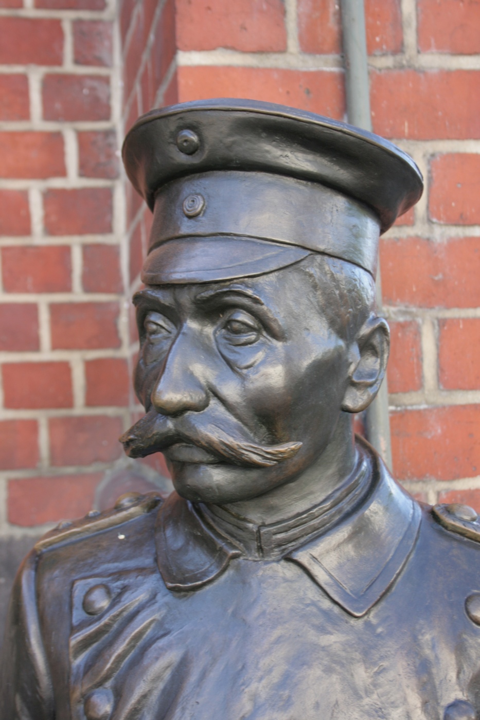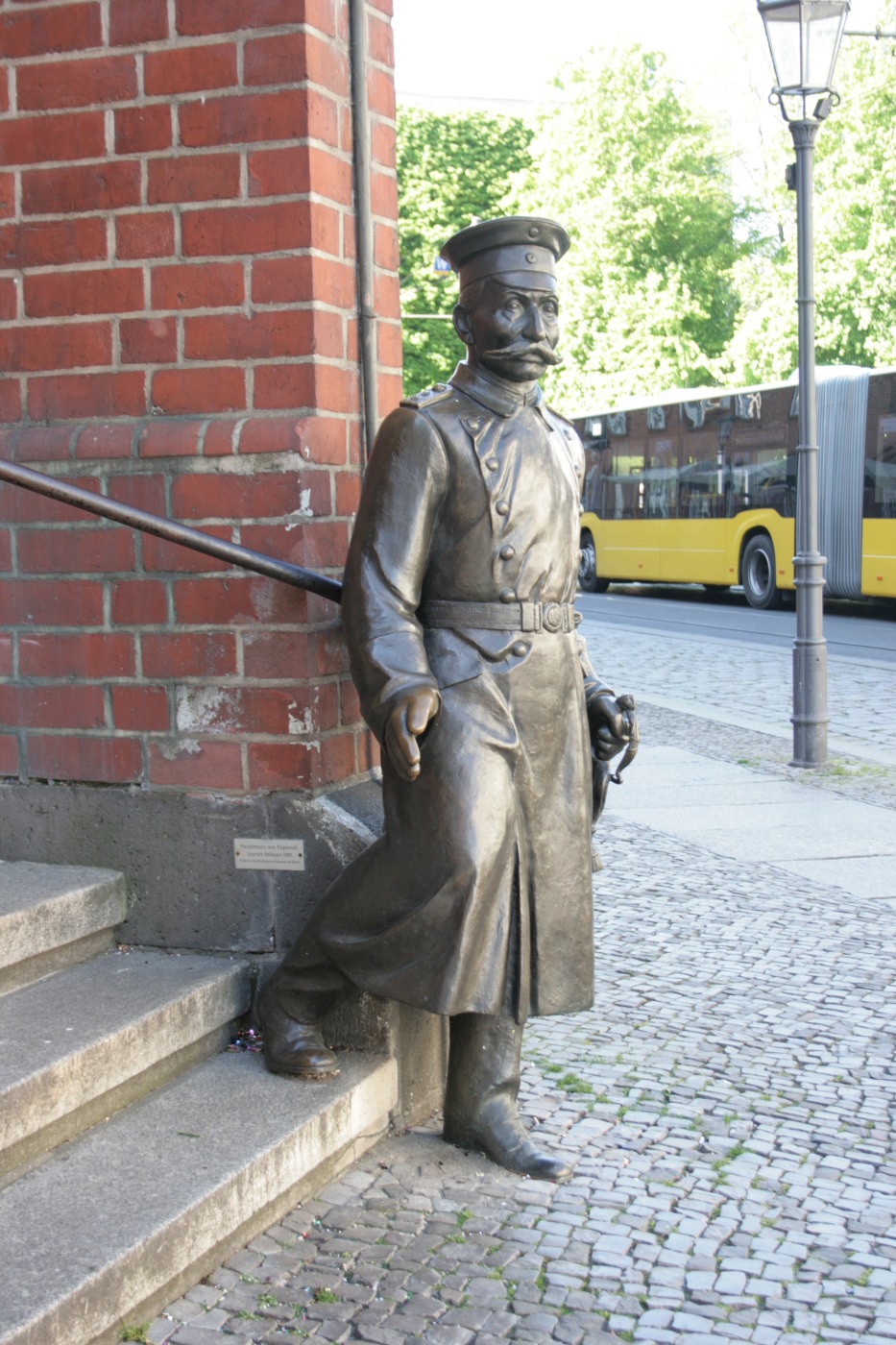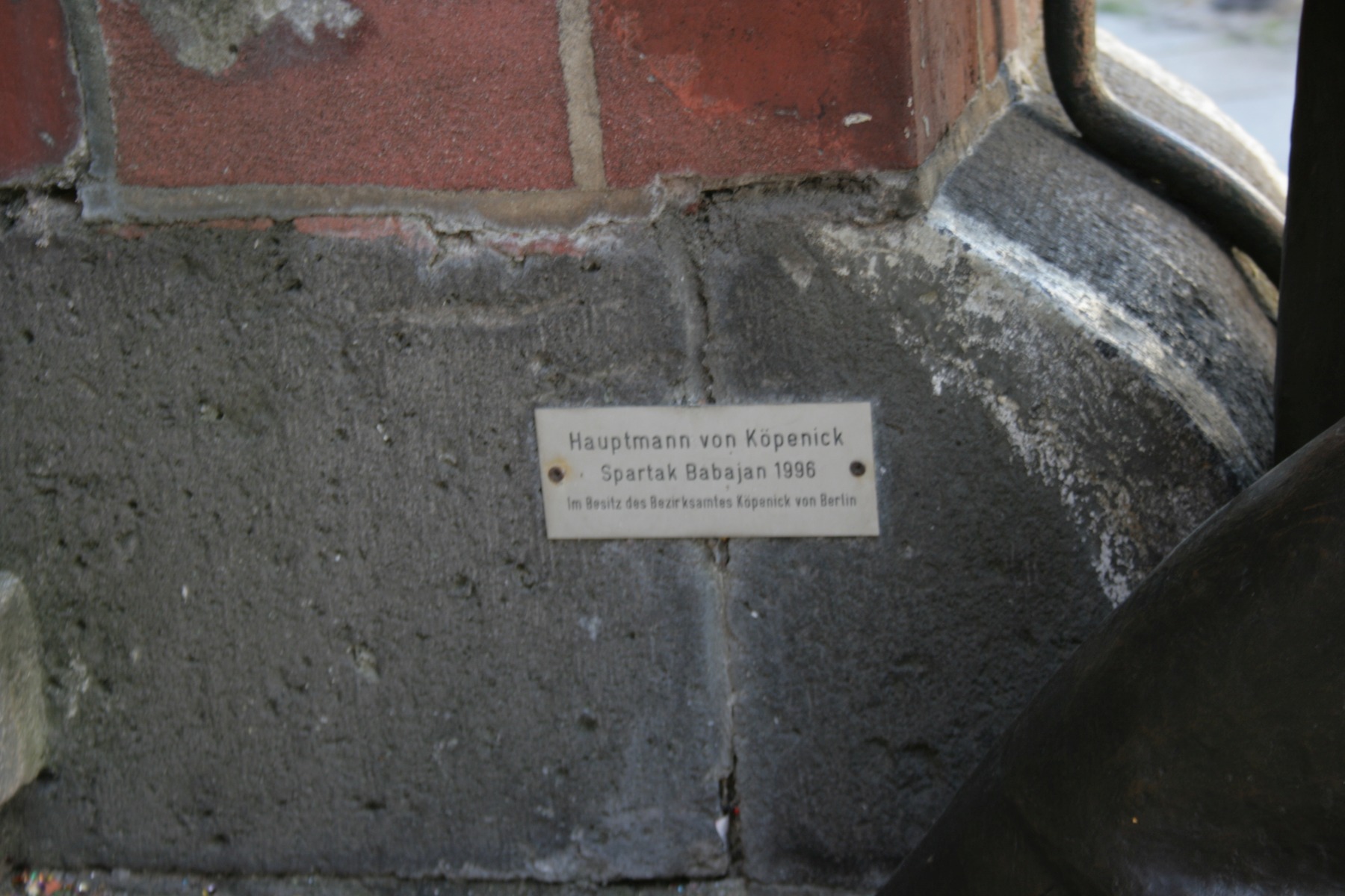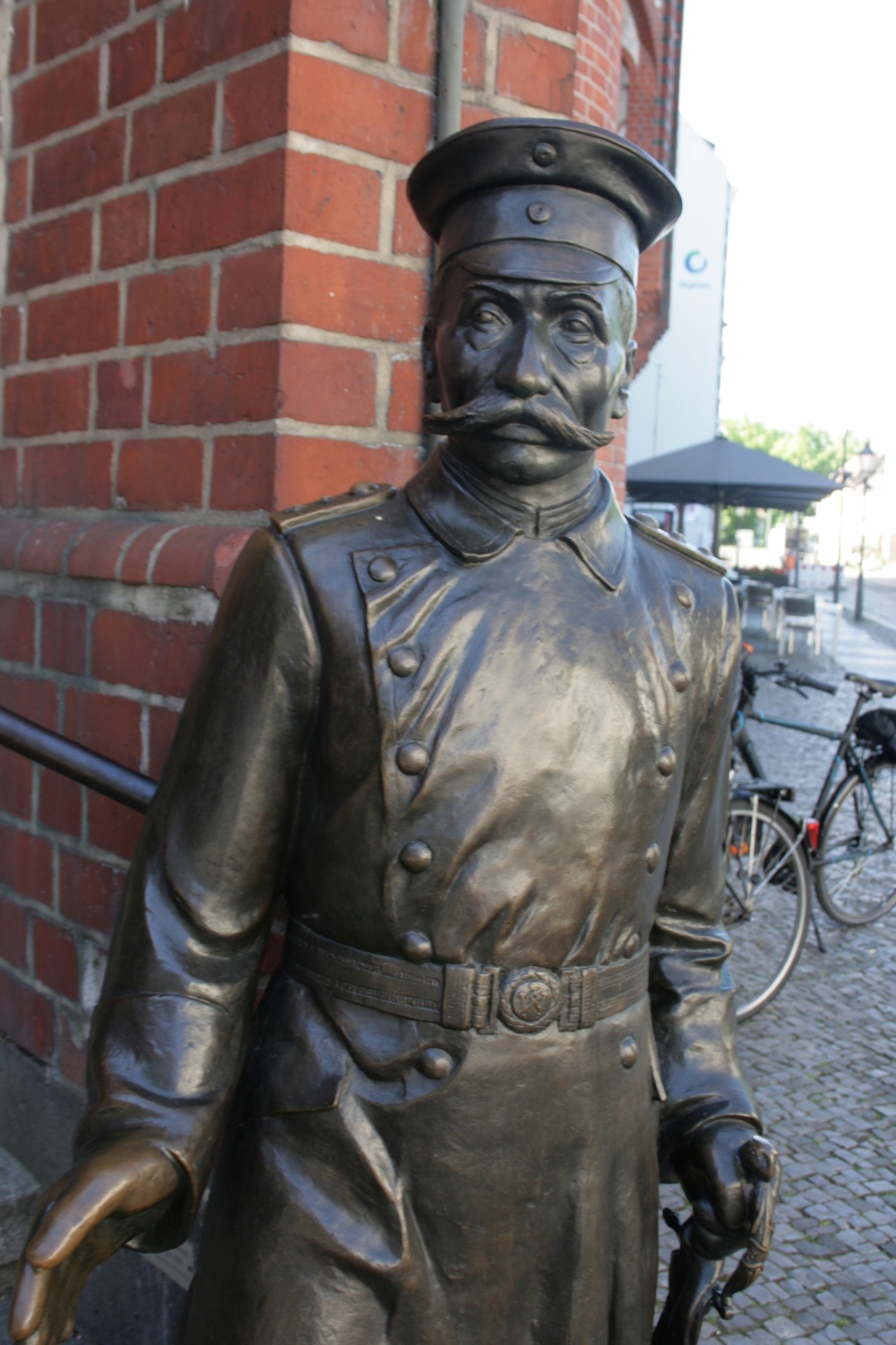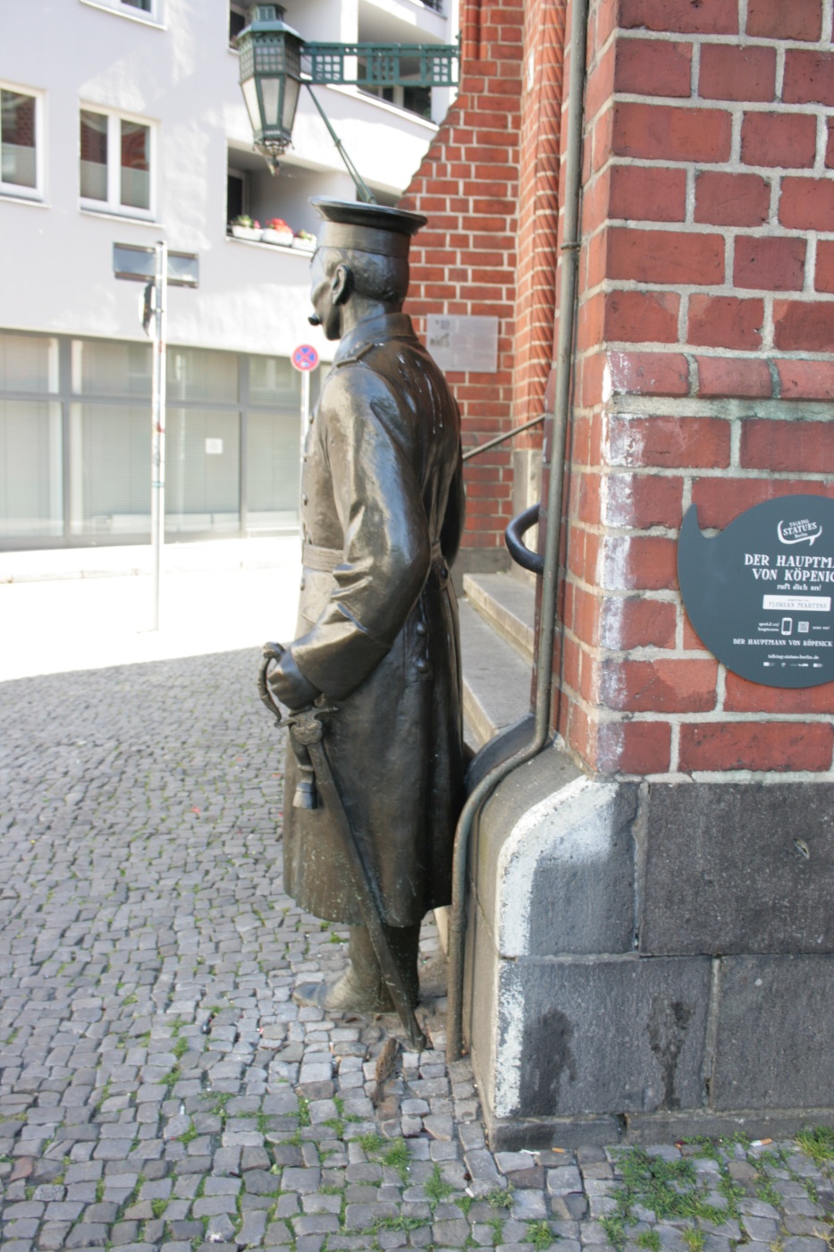Auf der Treppe zum Rathaus steht plinthenlos die genrehaft-naturalistisch formulierte, leicht überlebensgroße, zeitgenössisch militärisch bekleidete Standfigur des so genannten Hauptmanns von Köpenick mit einem Porträt des Schusters Friedrich Wilhelm Voigt (1849-1922) (Lamis-Mona Rieger).