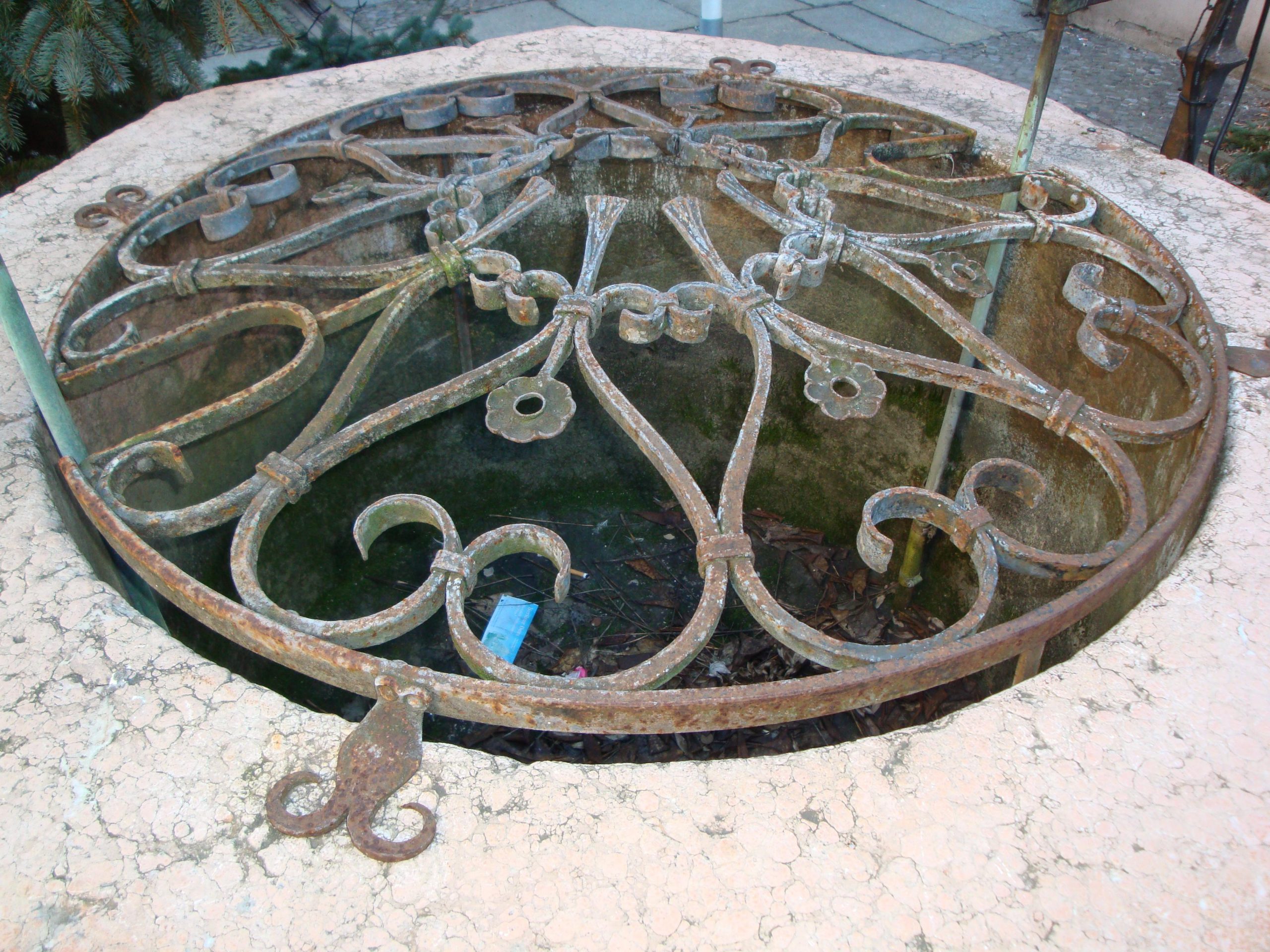 Schmuckbrunnen in Gestalt eines Ziehbrunnens. Auf einem aus verschiedenen Blöcken zusammengefügten, achteckigen Sockel aus rötlich geflecktem Marmor grobkörniger Qualität ruht ein achteckiges Brunnenbecken. Das Becken imitiert (?) mediterrane Vorbilder, wie sie etwa durch Aushöhlung antiker und mittelalterlicher Säulenkapitelle entstanden sind. Die Beckenwände zeigen eine Dekoration aus stilisierten Akanthusblättern. Dieser Schmuck geht auf mittelalterliche Vorbilder zurück, die ihrerseits bereits antike korinthische Kapitelle zitieren. Die Hauptschauseite zeigt ein Wappen mit dem heraldischen Motiv eines Greifvogels. Die als Aufmontierung erscheinende, schmiedeeiserne Verzierung, die merkwürdigerweise aus dem ursprünglichen Schöpfbrunnen offenbar einen (vorgeblichen) Ziehbrunnen machen sollte, wurde 1987 hinzugefügt (Jörg Kuhn).