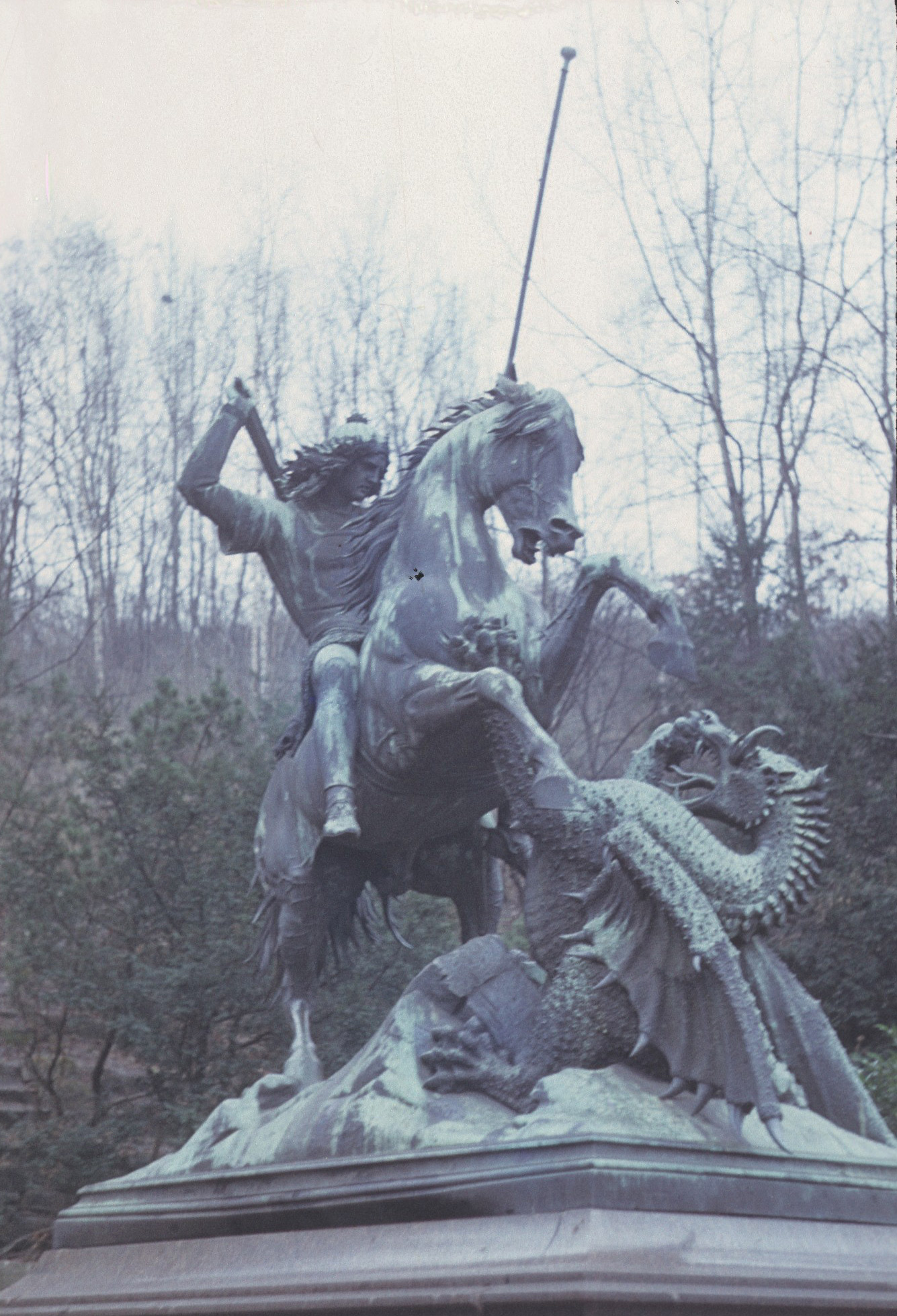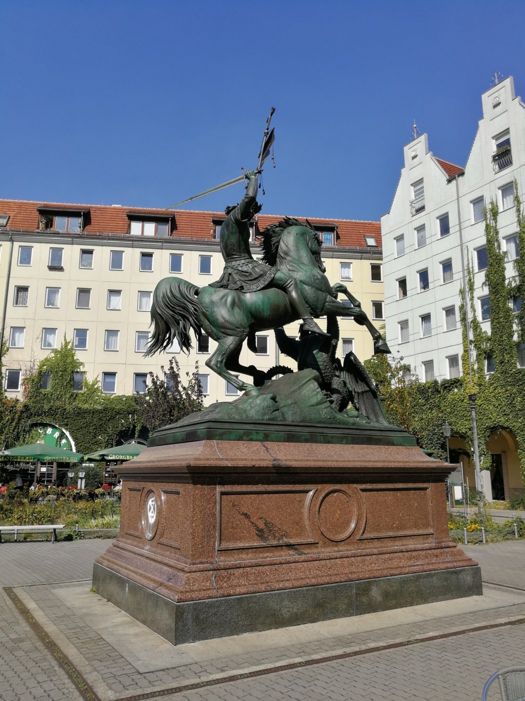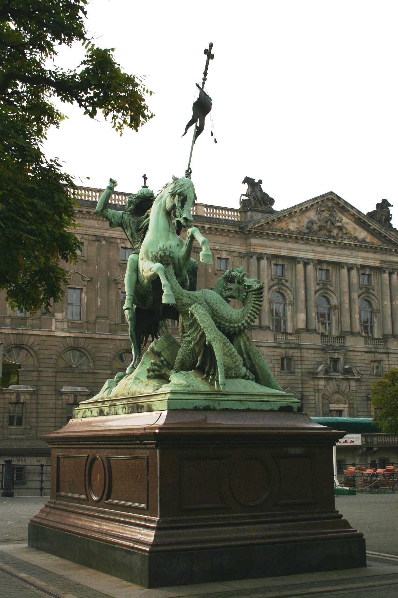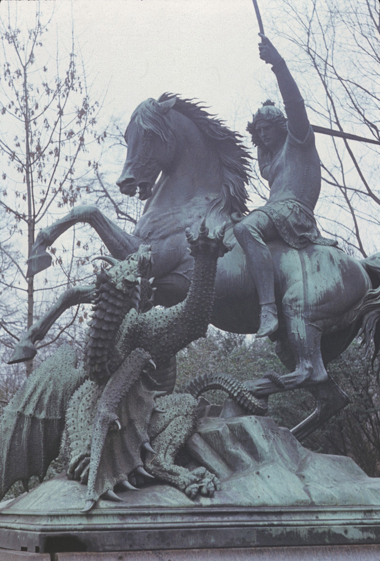Die überlebensgroße Reitergruppe eines Hl. Georg im Kampf mit dem Drachen steht auf einem mächtigen, aus polierten rötlichen Granitplatten und Werkstücken gefügten Sockel, dessen Gliederungsmotive auf antike Vorbilder zurückgreifen. Die Bronzegruppe selbst zeigt über rechteckiger Plinthe mit kräftigem Naturrelief eine stark bewegte, bei aller Idealisierung realistisch formulierte Kampfgruppe. Ein sich aufbäumendes Pferd, den ideal gebildeten, antikisch bekleideten Krieger Georg tragend, scheut vor einem gewaltigen Untier in Gestalt eines Fantasiedrachens, der sich flügelschlagend und fauchend gegen seinen Bezwinger zu wehren versucht (Jörg Kuhn).