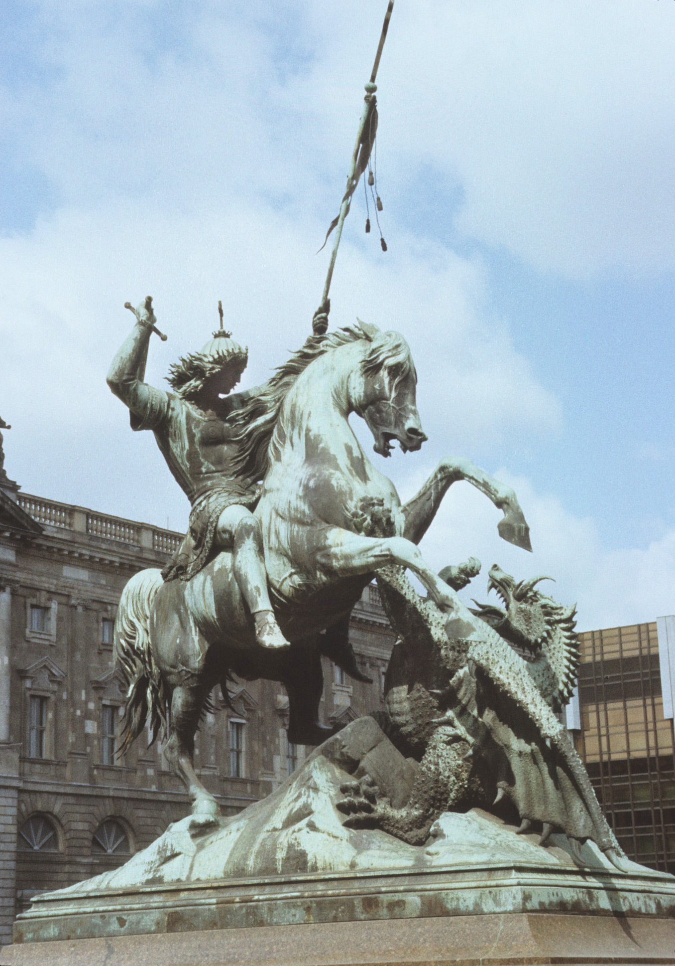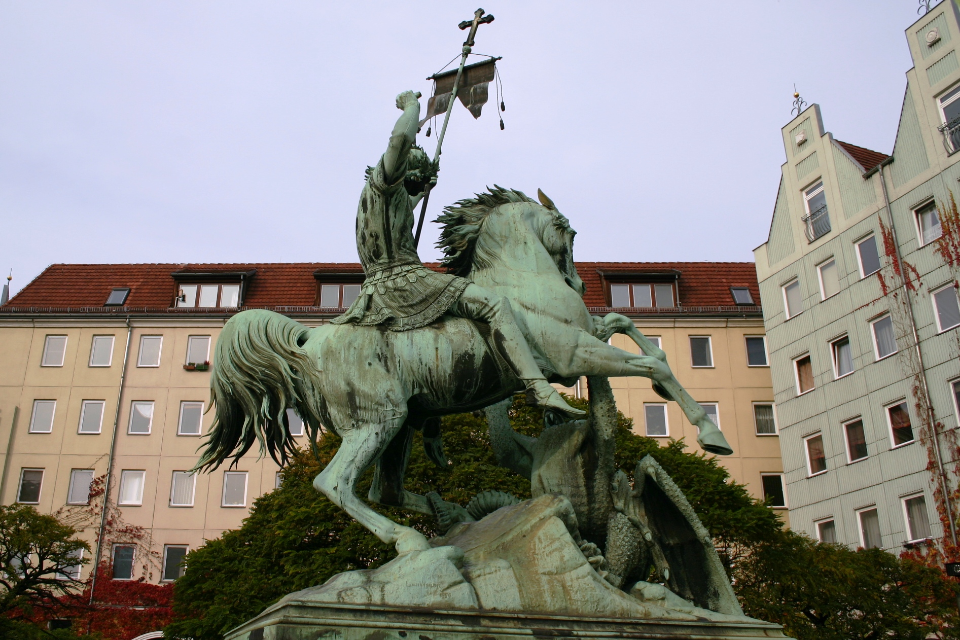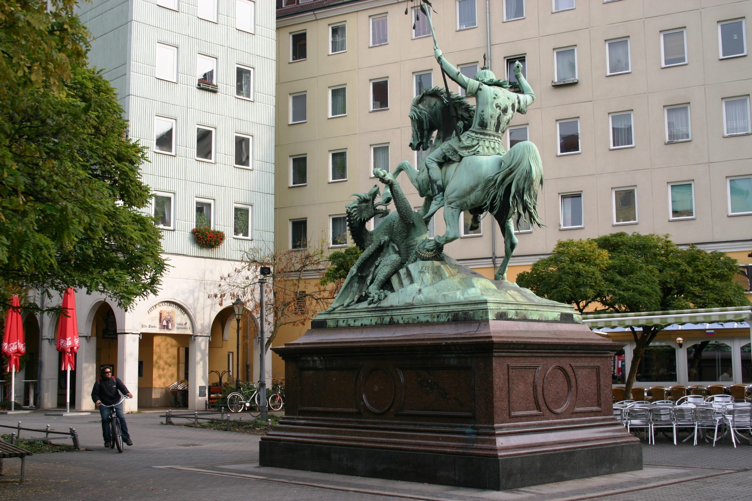 Die überlebensgroße Reitergruppe eines Hl. Georg im Kampf mit dem Drachen steht auf einem mächtigen, aus polierten rötlichen Granitplatten und Werkstücken gefügten Sockel, dessen Gliederungsmotive auf antike Vorbilder zurückgreifen. Die Bronzegruppe selbst zeigt über rechteckiger Plinthe mit kräftigem Naturrelief eine stark bewegte, bei aller Idealisierung realistisch formulierte Kampfgruppe. Ein sich aufbäumendes Pferd, den ideal gebildeten, antikisch bekleideten Krieger Georg tragend, scheut vor einem gewaltigen Untier in Gestalt eines Fantasiedrachens, der sich flügelschlagend und fauchend gegen seinen Bezwinger zu wehren versucht (Jörg Kuhn).