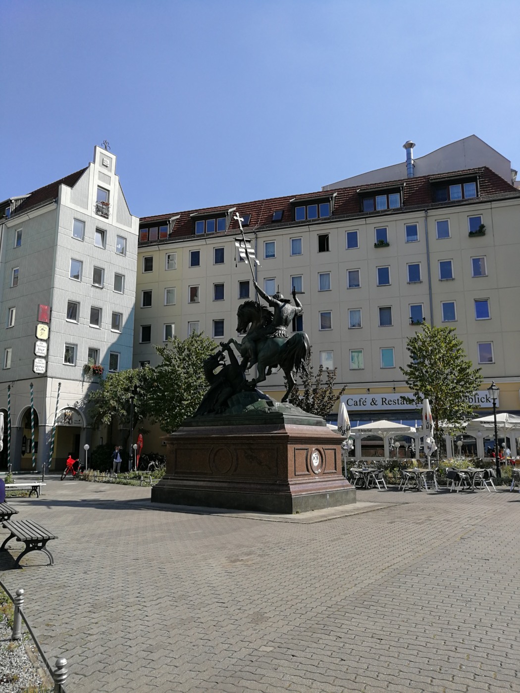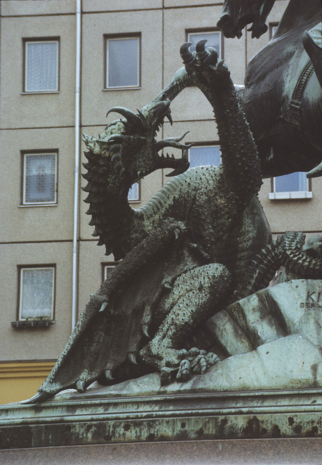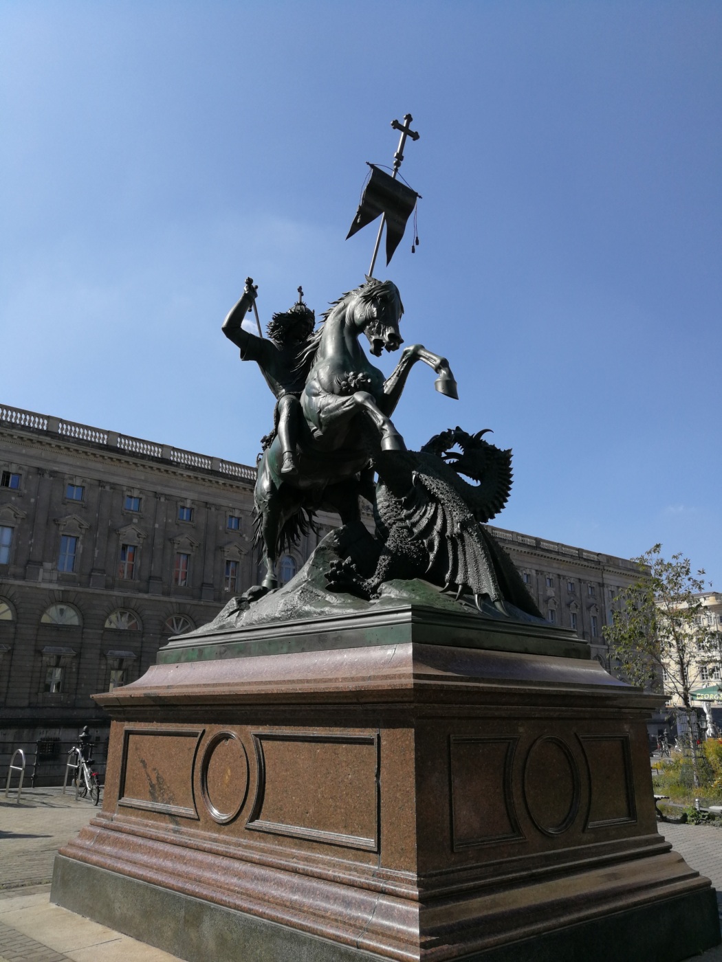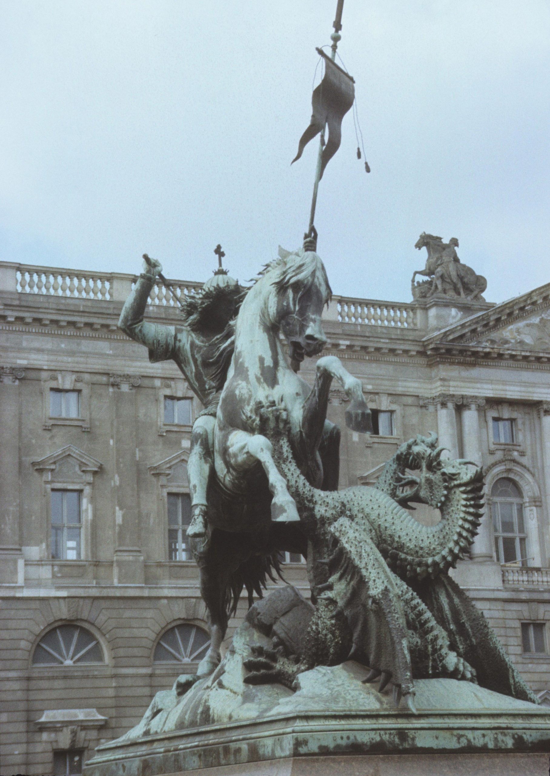Die überlebensgroße Reitergruppe eines Hl. Georg im Kampf mit dem Drachen steht auf einem mächtigen, aus polierten rötlichen Granitplatten und Werkstücken gefügten Sockel, dessen Gliederungsmotive auf antike Vorbilder zurückgreifen. Die Bronzegruppe selbst zeigt über rechteckiger Plinthe mit kräftigem Naturrelief eine stark bewegte, bei aller Idealisierung realistisch formulierte Kampfgruppe. Ein sich aufbäumendes Pferd, den ideal gebildeten, antikisch bekleideten Krieger Georg tragend, scheut vor einem gewaltigen Untier in Gestalt eines Fantasiedrachens, der sich flügelschlagend und fauchend gegen seinen Bezwinger zu wehren versucht (Jörg Kuhn).