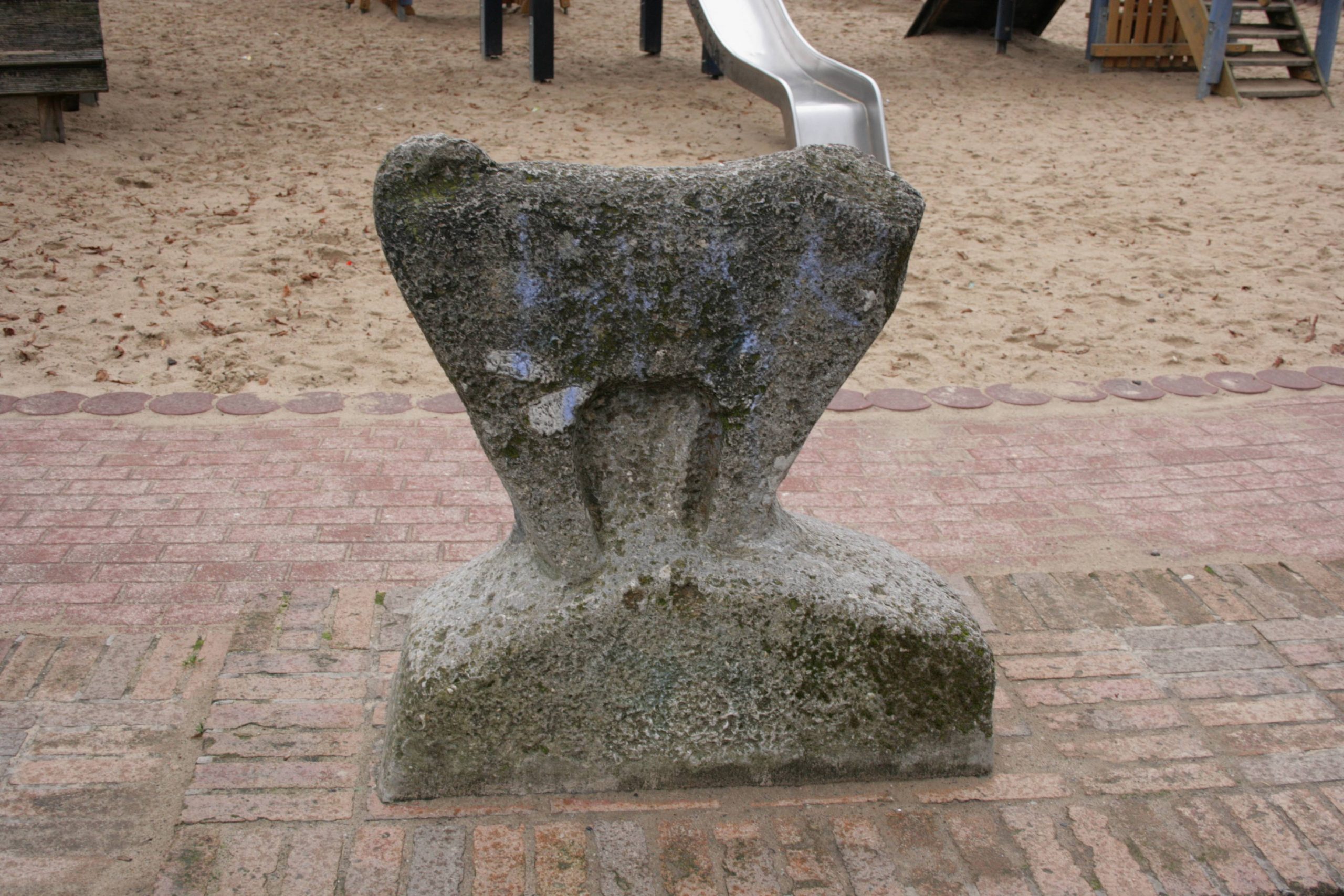 Tierskulptur zum Bespielen und Beklettern. Die Figur des Hundes steht auf einer Plinthe mit rechteckigem Grundriss, die zur Mitte hin erhöht ist. Der Hund, er hatte vor seiner Fragmentierung eine Höhe von etwa 1,30 Metern. Er ist stark stilisiert dargestellt. Die Beine sind recht geschlossen und parallel gestellt. Der Schwanz ist wedelnd erhoben und liegt am Körper an, der Kopf war nach oben gestreckt. Der Hund hatte spitze nach oben gestellte Ohren, er war in freudiger Erwartungshaltung dargestellt (Susanne Kähler, Jörg Kuhn).