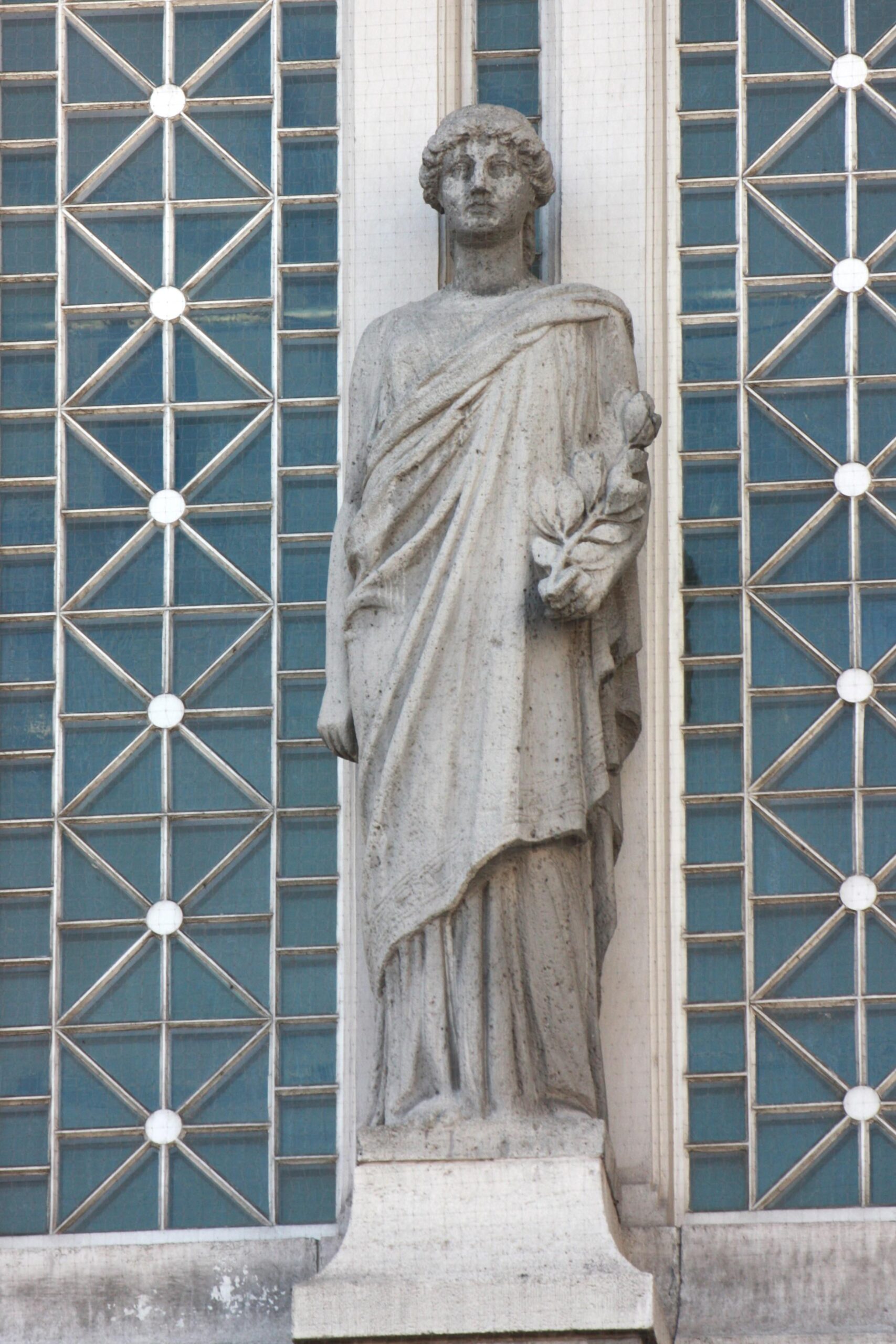 In der von einem Korbbogen überwölbten Nische des ehemaligen Neuen Schauspielhauses, hinter der sich der ehemalige Mozartsaal befand, stehen vor den riesigen Fenstern auf hohen Postamenten zwei weibliche Statuen in antik anmutenden Gewändern (Nicola Vösgen).