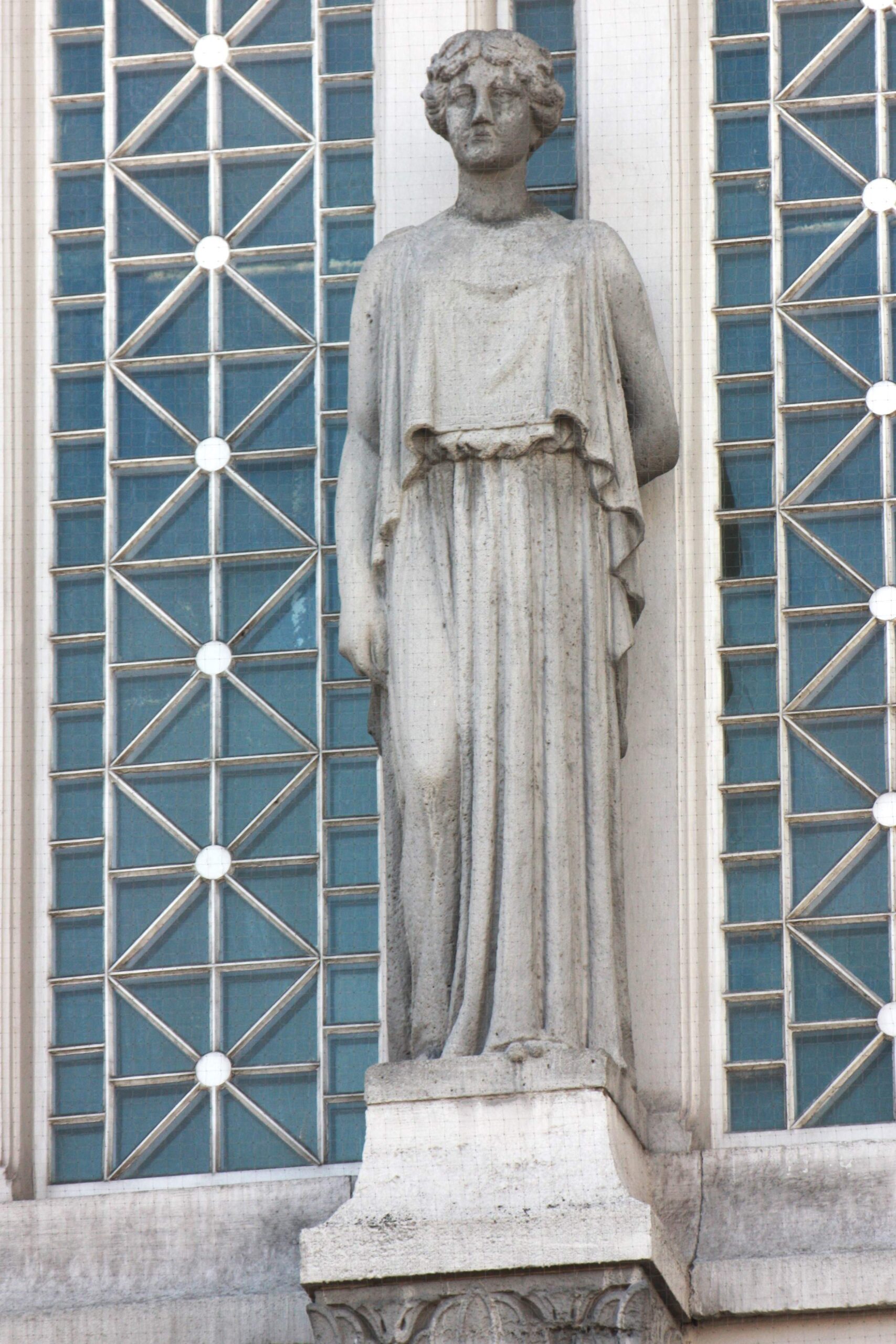 In der von einem Korbbogen überwölbten Nische des ehemaligen Neuen Schauspielhauses, hinter der sich der ehemalige Mozartsaal befand, stehen vor den riesigen Fenstern auf hohen Postamenten zwei weibliche Statuen in antik anmutenden Gewändern (Nicola Vösgen).