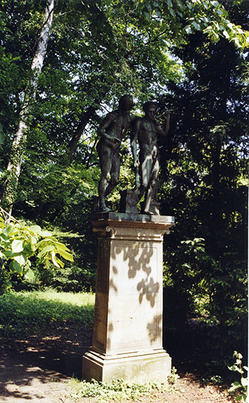 Am nördlicher Abfluss des Karpfenteiches, östlich der sich in der Hauptachse des Schlosses befindlichen Eisenbrücke steht die bronzene Antikenkopie der Ildefonsogruppe auf einem hohen schmalen Sandsteinsockel, der im oberen Bereich durch Voluten verziert ist.
