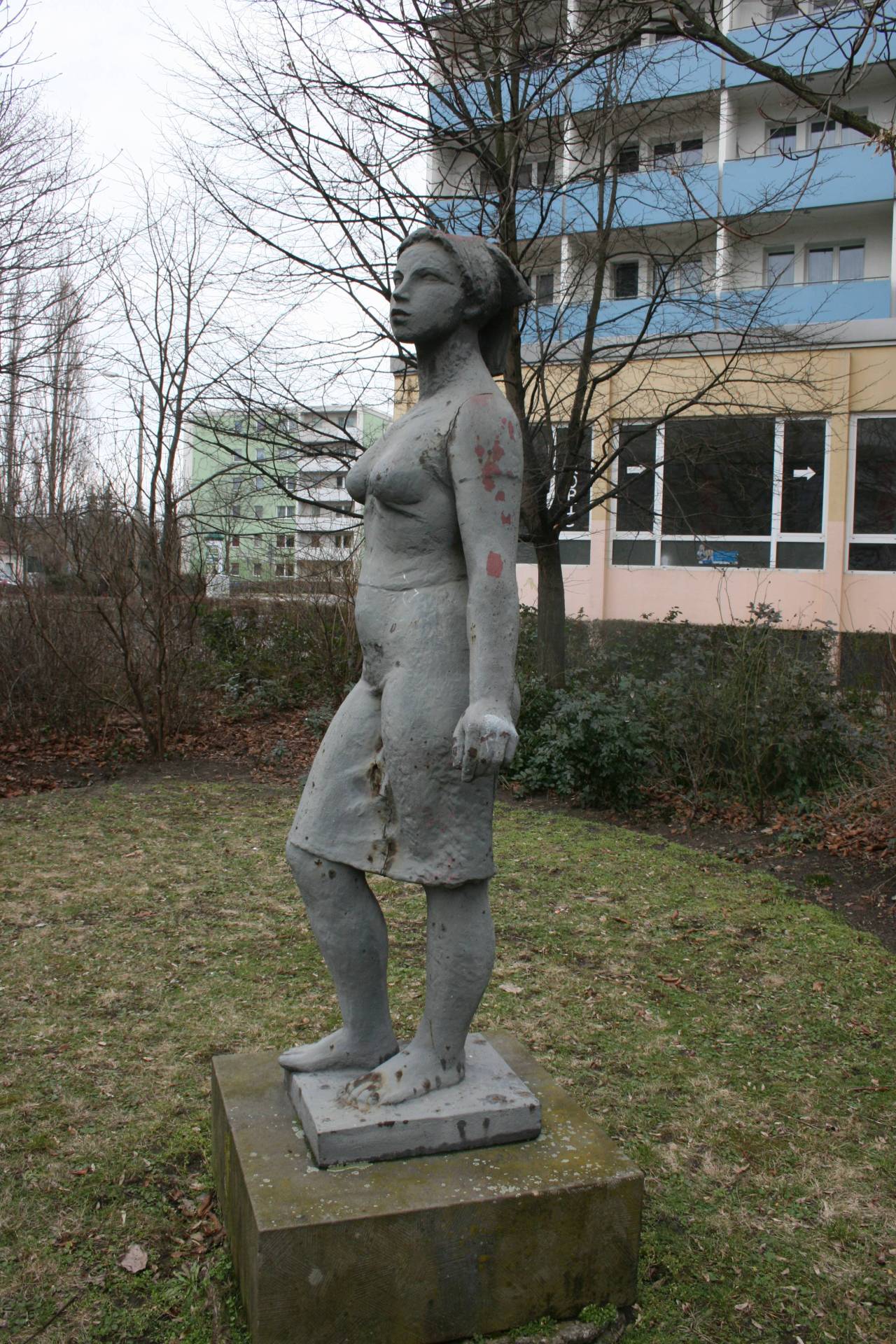 Auf einem unten leicht eingezogenen, rechteckigen Sandsteinsockel von sehr sorgfältiger Bearbeitung steht über quadratischer Plinthe die aus Eisen gegossene, grau gefasste Figur einer beschwingt gehenden, jungen, russischen bzw. sowjetischen Bäuerin. Die junge Frau ist ländlich-sommerlich mit dünnstoffigem Leibchen, ausschwingendem Rock und Kopftuch über dem hinten zum Pferdeschwanz gebundenen Haar bekleidet. Der Kopf ist, leicht aufschauend, nach links gewendet. Die in leichter Schrittstellung gezeigten Füße sind unbedeckt. Das idealisierte Gesicht ist frisch und ohne jede Alterungsspur. Die betonten Brüste mit deutlich formulierten Brustwarzen scheinen durch das Obergewand durch. Obwohl kein Saatgut zu sehen ist, auch keine Saatguttasche oder ein Saatguttuch, scheint die Bäuerin gerade im Begriff des Sähens zu sein. Die rechte Hand holt, entsprechend hohl geformt, nach hinten aus. Die Plastik ist auf der Plinthe hinten rechts in kyrillischer Schreibschrift vertieft mit dem Namen des Künstlers bezeichnet (Susanne Kähler, Jörg Kuhn).