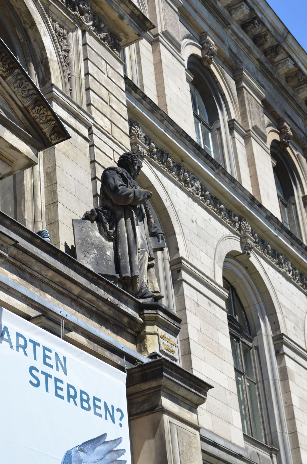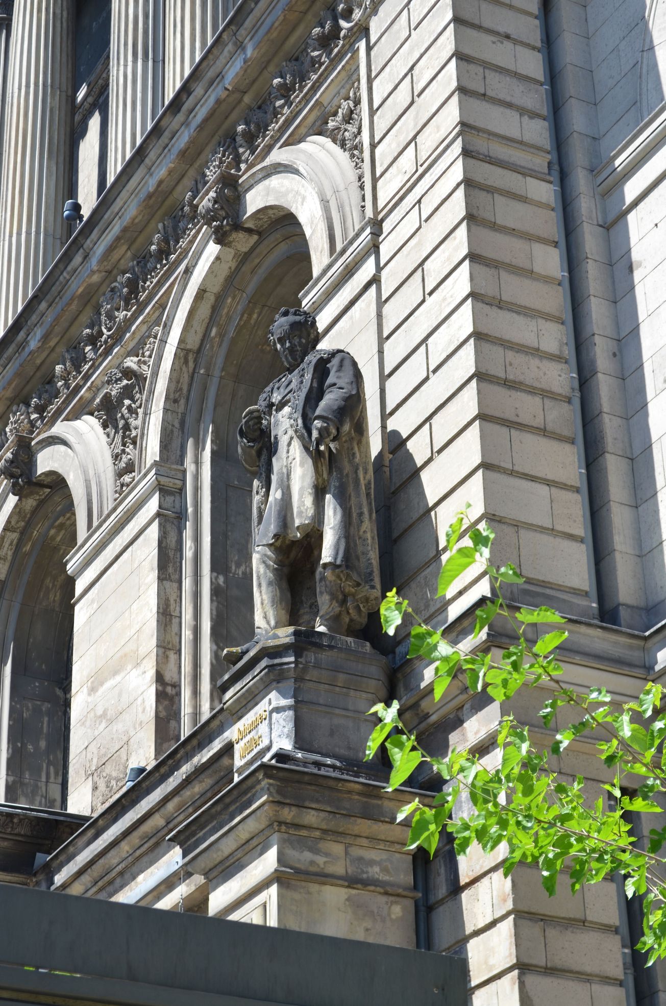 Die Statuen von Leopold von Buch und Johannes Müller wurden vom Bildhauer Richard Ohmann im Zuge des Baus gefertigt und an der Fassade des Eingangs angebracht. Johannes Peter Müller war Mediziner, Naturphilosoph, Physiologe und vergleichender zoologischer Anatom u.a. für Meeresbiologe. Er war zudem Professor für Anatomie und Physiologie in Berlin und später Direktor des Anatomisch-Zootomischen Museums. Er gilt als einer der bedeutendsten Physiologen des 19. Jahrhunderts (vgl. Humboldt-Univsersität zu Berlin).